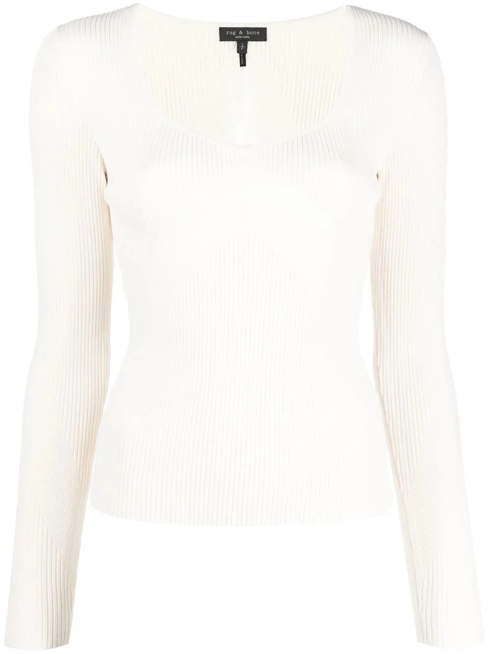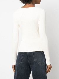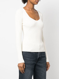 U-neck long-sleeved top Highlights - Ivory white - V-neck - Long sleeves - Curved hem - Pullover design Made in United States Composition Viscose 57%, Nylon 41%, Spandex/Elastane 2% SIZE & FIT Model measurements Height 5 ft 11 in(1.8 m) Bust/Chest 31.49 in(80 cm) Hips 35.82 in(91 cm) Waist 24.8 in(63 cm) FittingInformation This piece fits true to size. We recommend you get your regular size Cut for a close fit Made with a mid-weight stretch fabric Washing instructions Dry Clean Only