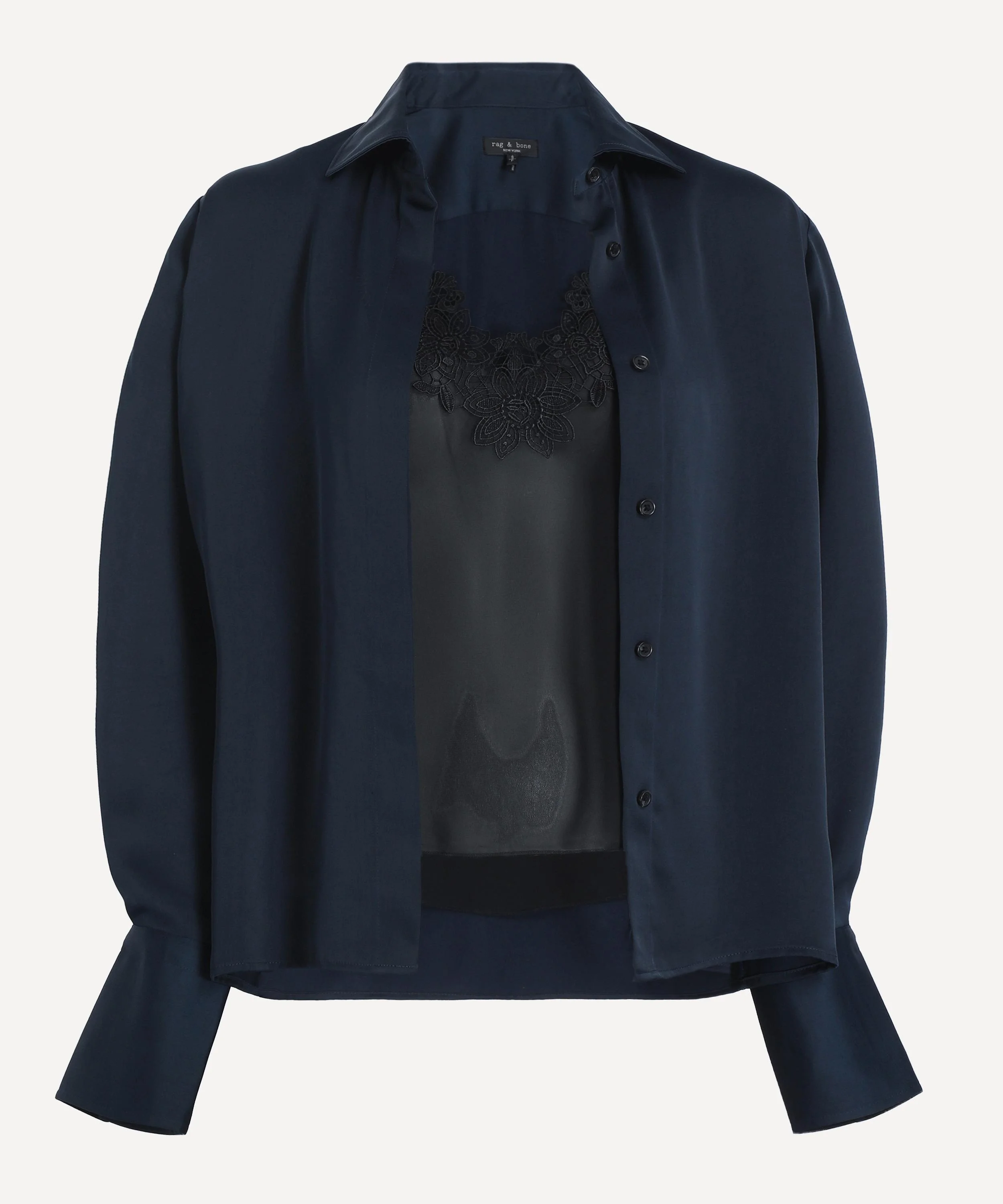 DETAILS Crepe blouse Two-in-one design Regular fit fit Point collar Concealed button closure Lace-trimmed attached camisole lining SIZE & FIT Model is 178.5cm/5'10" ; Chest: 77.5cm; Waist: 58.5cm; Hips: 86cm and wears a size S COMPOSITION & CARE 100% Polyester Dry clean