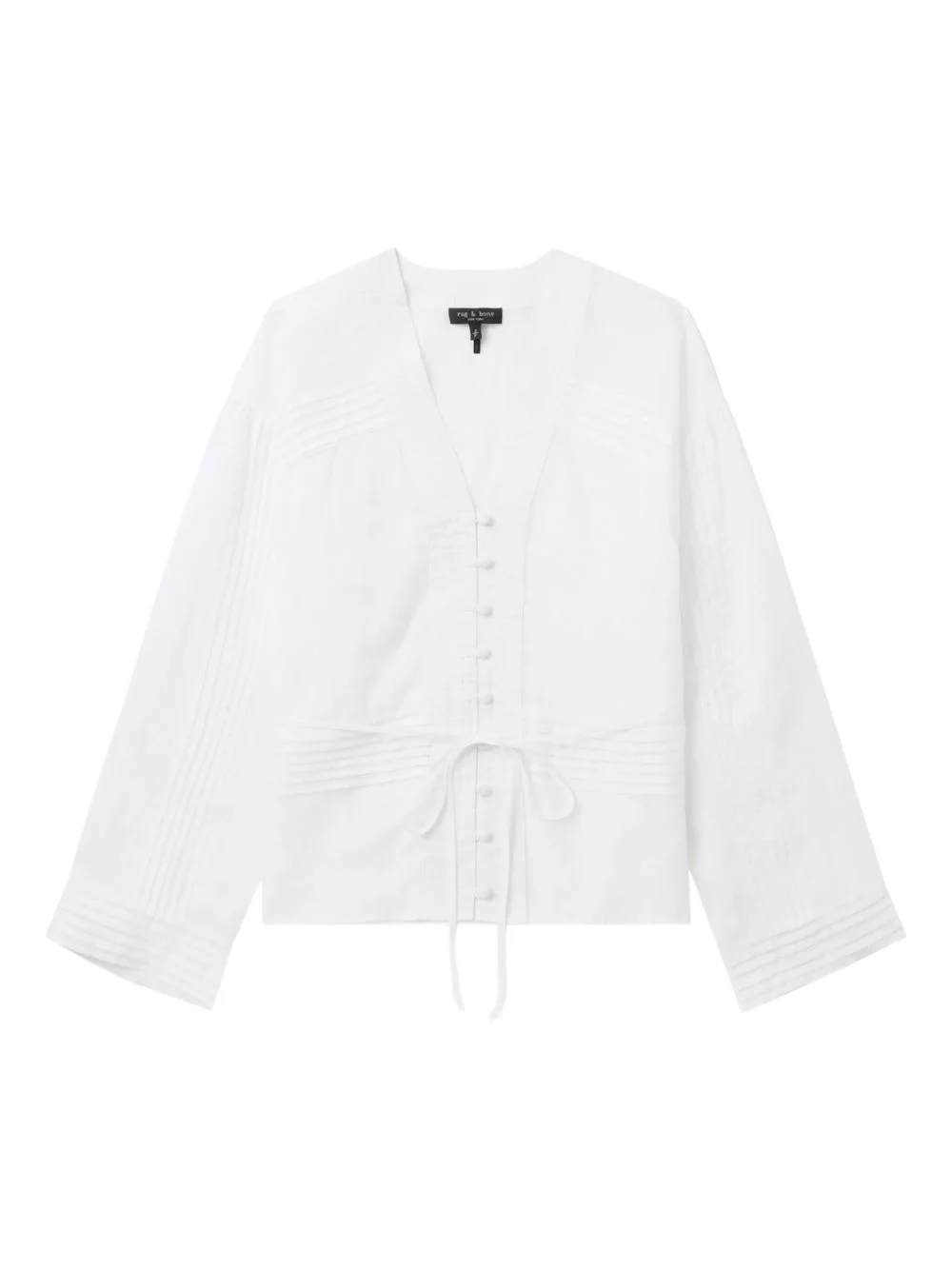 Viviana pintuck V-neck shirt Highlights - White - V-neck - Button front - Pintuck detailing - Long sleeves - Drawstring waist Imported Composition Ramie 100% Washing instructions Read Manufacturer Guidelines