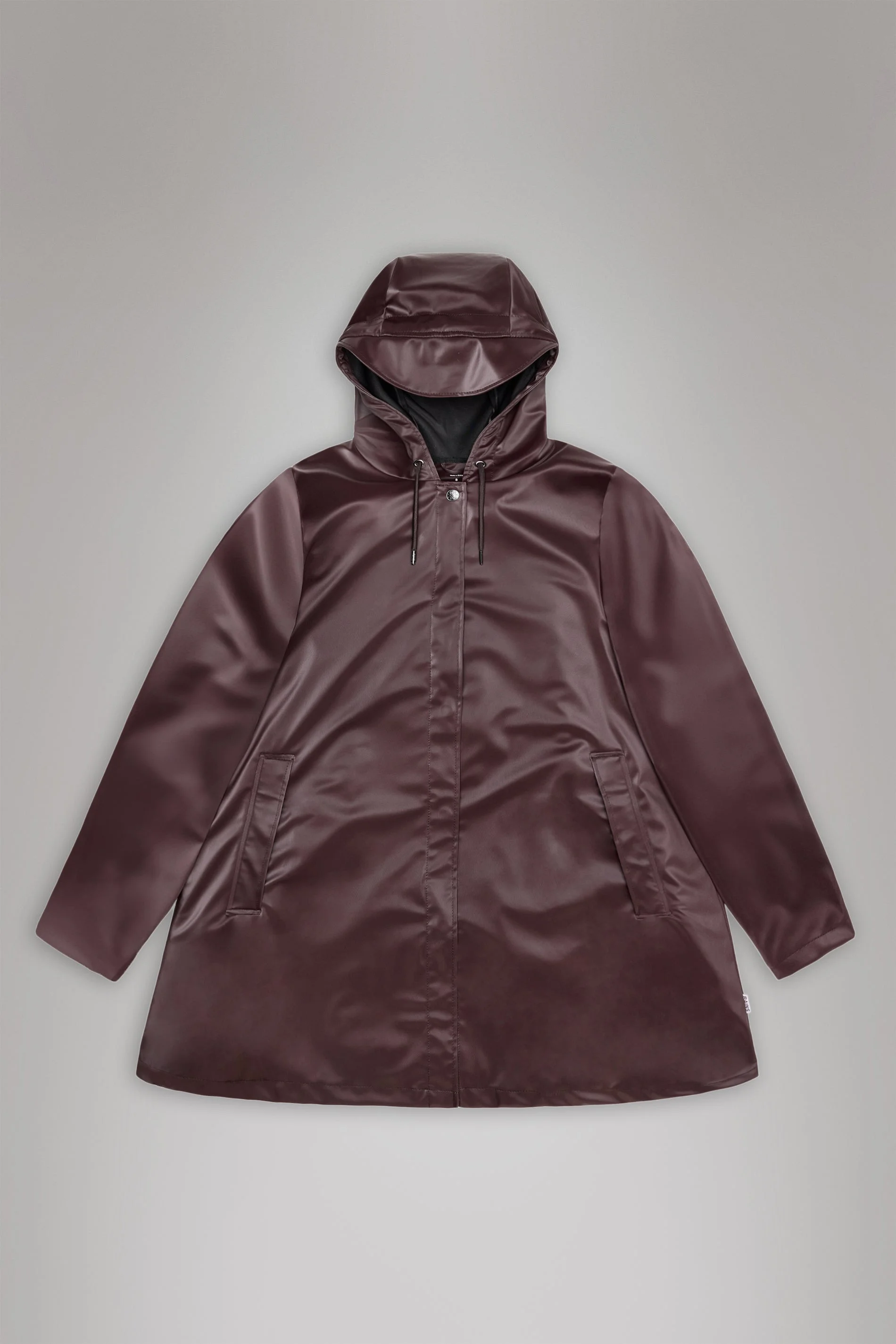 A-Line Jacket is a women's raincoat characterized by its A-shaped silhouette in an elegant design. A-line Jacket gradually builds in volume from chest to hem with a soft, lightweight feel and elegant drape. It features a drawstring hood with built-in cap, two side pockets and snap adjustable cuffs. This rain coat is completed and closed with hidden snap buttons and a front placket. Under-arm eyelets ensure ventilation for breathable comfort. A-Line Jacket is cut from Rains' signature PU fabric and features welded seams, making the jacket both resistant to water and wind. The finish is lightweight with a smooth feel. SKU: 18050\129 Details Composition: 100.00% PES (Polyester) Water column: 5000 mm Windproof: Protection against windchill Weight: 16.9 oz Features: