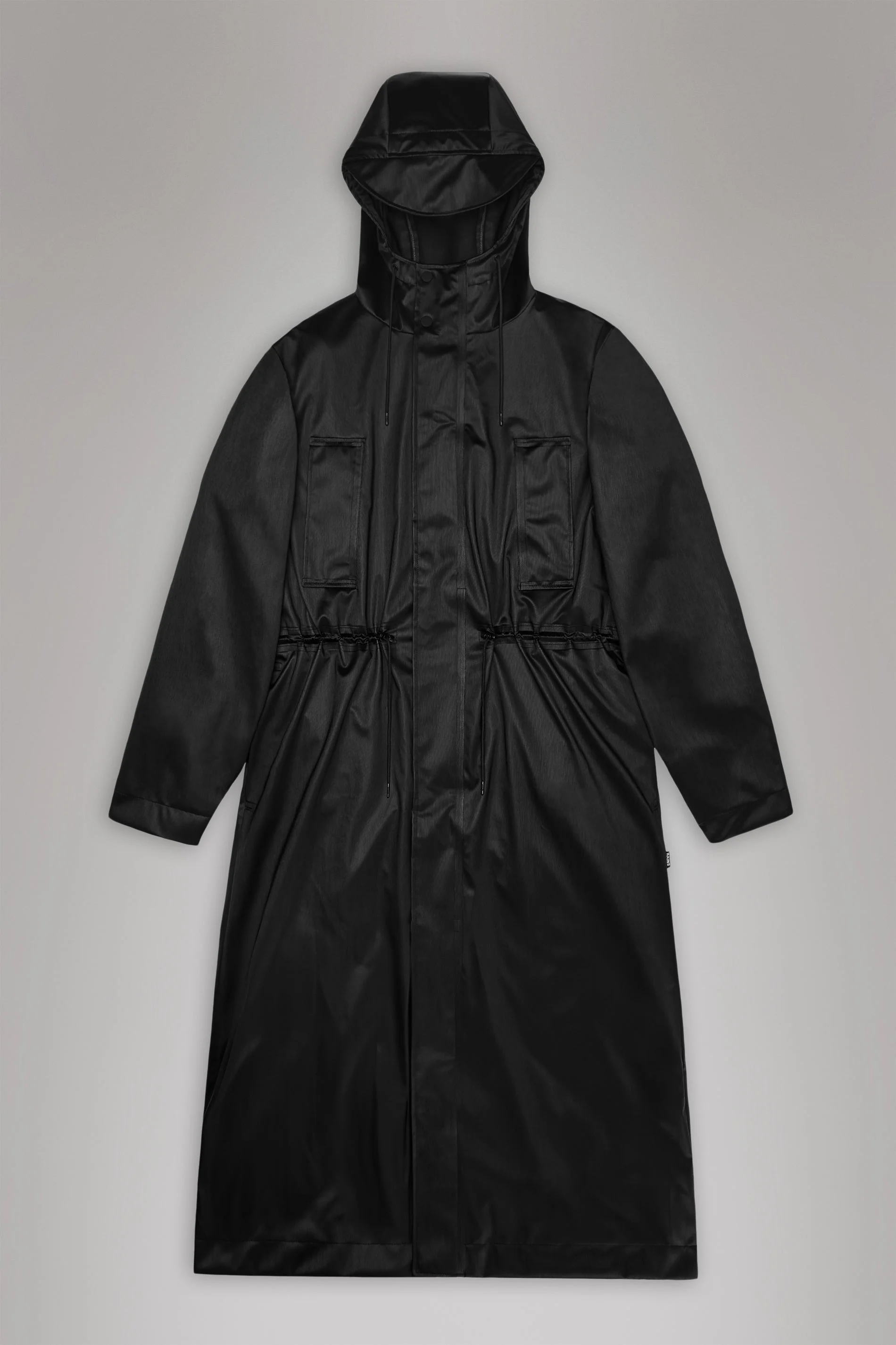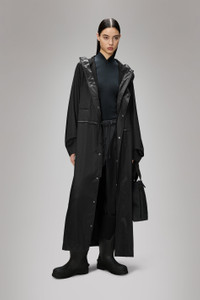 Bold Longest Jacket is a unisex rain jacket with a longer and more exaggerated fit. The elevated design delivers high functionality in a bold silhouette. Bold Longest Jacket is playing with details in a courageous way. Design features a hood with tie cord, zipper closure under a storm flap with invisible snaps and snap closure at cuffs. Back features an exaggerated yoke with mesh lining underneath for breathable comfort. The maxi jacket is completed with a string adjustment at waist and two wide welt slip in pockets to transport and keep your essentials dry moving through the city. This design is cut from Rains’ signature PU fabric and features welded seams. The finish is lightweight with a smooth feel. SKU: 12120\84 Details Composition: 100.00% PES (Polyester) Water column: 5000 mm Windproof: Protection against windchill Fit: Longest Weight: 26.8 oz Features - Waterproof signature PU fabric - Zip closure under wide storm flap with snaps - Hood with tie cord - String adjustment at waist - Exaggerated back yoke with mesh lining underneath - Wide welt slip in pockets - Welded seams - Maxi fit
