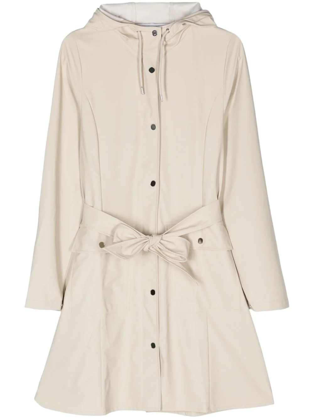 Curve W hooded raincoat Highlights - Beige - Lightweight construction - Waterproof/windproof - A-line - Drawstring hood - High neck - Front press-stud and zip fastening - Long sleeves - Two front stud-fastening pockets - Belt loops - Detachable belt - Straight hem - Below-knee length Imported Composition Polyurethane 100%, Polyester 100% Washing instructions Machine Wash