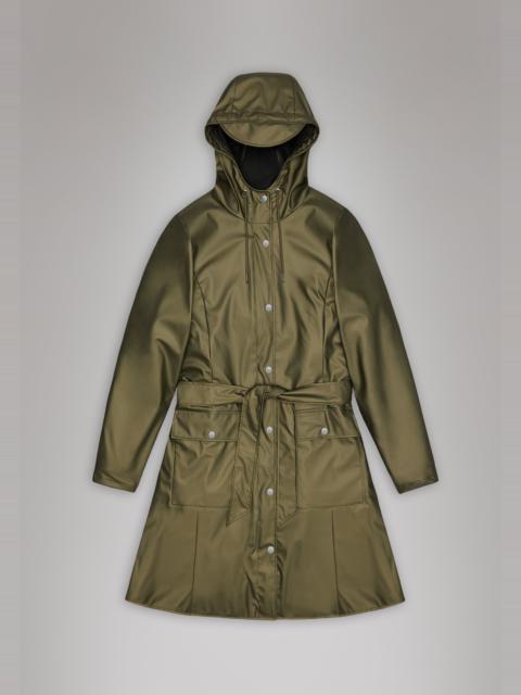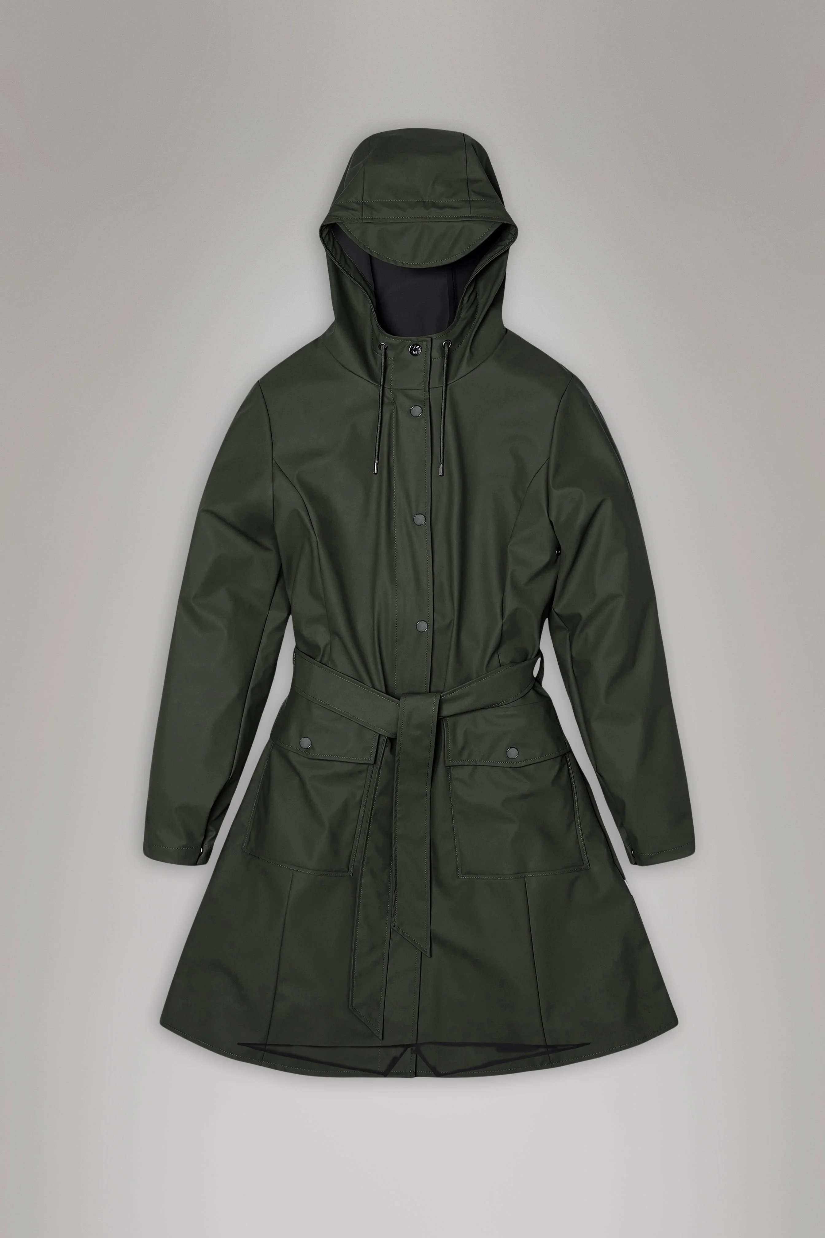 Curve W Jacket is a clean women's raincoat with a slightly shaped silhouette accentuating the waist. Designed to block out water, wind and chill. This design with a minimal silhouette is Rains' interpretation of the women's trenchcoat. The design is figure-flattering with high functionality. Curve Jacket is a weather-ready staple designed with a drawstring hood with built-in cap, coated zip closure with snap-fastened placket and snap adjustment at sleeve cuffs. The look is completed with two front pockets and under-arm eyelets to ensure breathable comfort. This women's rain jacket is cut from Rains' signature PU fabric and features ultrasonically welded seams. The finish is lightweight with a smooth feel. SKU: 18130\03 Details Composition: 100.00% PES (Polyester) Water column: 5000 mm Windproof: Protection against windchill Fit: Long Weight: 19.4 oz Features - Waterproof signature PU fabric - Hood with built-in cap and drawstring - Coated zip closure including placket with snap fastenings - Belt at waist for shaped fit - Two front pockets with snaps - Snap adjustment at sleeve cuffs - Ventilation eyelets under arms - Welded seams - Fishtail hem - Slightly shaped fit