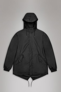 Fishtail Jacket is a unisex raincoat. Characterized by its pared-back aesthetic and drawstring fishtail hem. This design features utility-inspired pockets, vented back yoke and a hood with built-in cap and drawstring. Style is finished with elasticated cuffs for a tighter fit around wrist. Fishtail Jacket has a casual fit with an elegant drape, making it a clear cut raincoat for daily commutes. The coated zip closure is concealed by a placket with snap fastenings. This rain jacket is cut from Rains' signature PU fabric and features welded seams. The finish is lightweight with a soft feel. SKU: 18010\01 Details Composition: 100.00% PES (Polyester) Water column: 5000 mm Windproof: Protection against windchill Weight: 19.4 oz Features - Waterproof signature PU fabric - Hood with built-in cap and drawstring - Coated zip closure including placket with snap fastenings - Two utility front pockets - Elasticated cuffs for a tighter fit around wrist - Fishtail hem with drawstring - Elbow pleats for improved movement - Back yoke with concealed vents - Welded seams - Casual fit