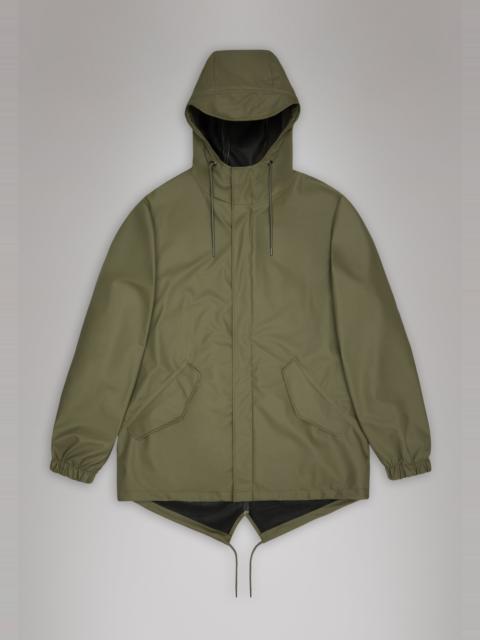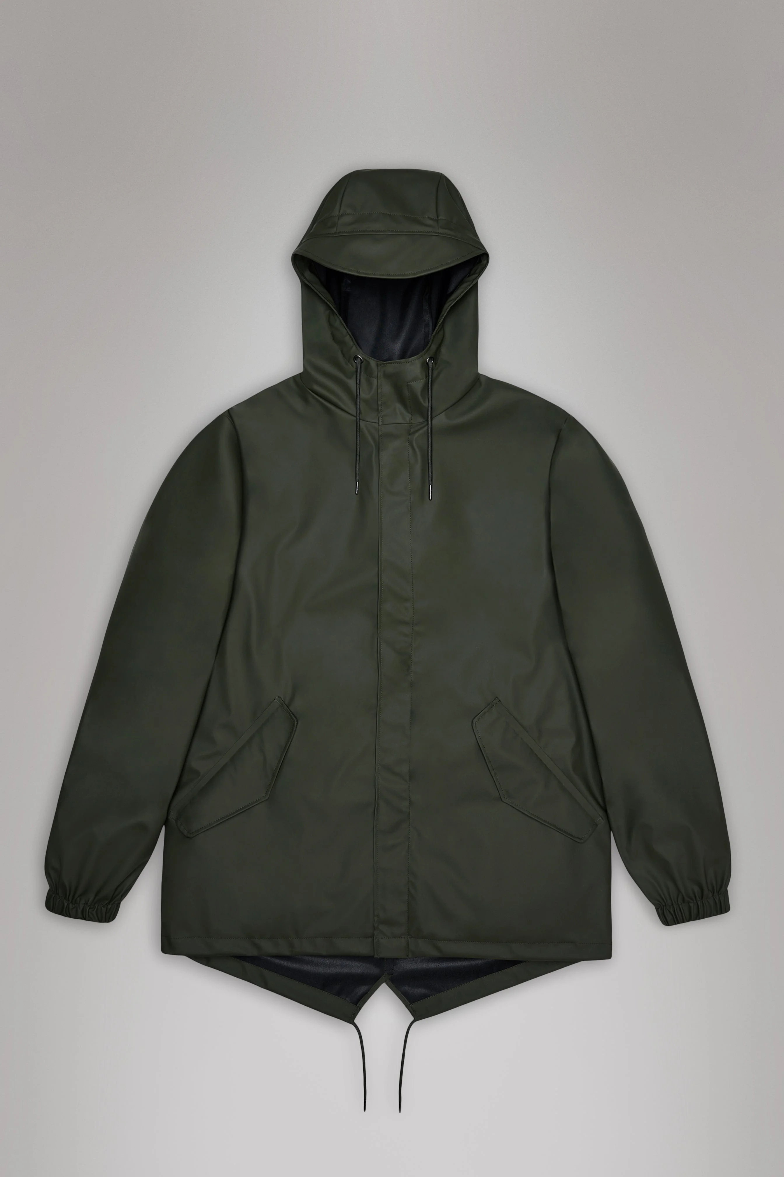 Fishtail Jacket is a unisex raincoat. Characterized by its pared-back aesthetic and drawstring fishtail hem. This design features utility-inspired pockets, vented back yoke and a hood with built-in cap and drawstring. Style is finished with elasticated cuffs for a tighter fit around wrist. Fishtail Jacket has a casual fit with an elegant drape, making it a clear cut raincoat for daily commutes. The coated zip closure is concealed by a placket with snap fastenings. This rain jacket is cut from Rains' signature PU fabric and features welded seams. The finish is lightweight with a soft feel. SKU: 18010\03 Details Composition: 100.00% PES (Polyester) Water column: 5000 mm Windproof: Protection against windchill Weight: 19.4 oz Features - Waterproof signature PU fabric - Hood with built-in cap and drawstring - Coated zip closure including placket with snap fastenings - Two utility front pockets - Elasticated cuffs for a tighter fit around wrist - Fishtail hem with drawstring - Elbow pleats for improved movement - Back yoke with concealed vents - Welded seams - Casual fit