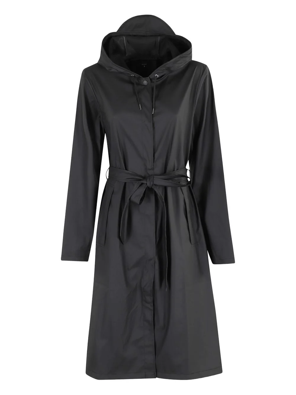 hooded belted raincoat Highlights - Black - Hood - Belt - Front pockets - Concealed snap fastening - Long sleeves Imported Composition Polyester 100% Washing instructions Machine Wash