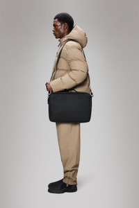 Laptop Bag is for anyone looking for the clean aesthetic of a computer sleeve with additional room, functionality and padding. This waterproof bag features a divided main compartment for easy organization. The external pocket fits a 15" laptop -- and may fit some 16". A timeless design for meetings and commutes. Details include a near-concealed revit-fastened handle strap, rubberized zip pullers and soft velvet-like inner lining. Laptop Bag is cut from Rains' signature waterproof PU fabric, engineered for carrying strength, durability and a smooth feel. SKU: 13290\01 Details Volume (liter): 1.6 gal Composition: 100.00% PES (Polyester) Water column: 8000 mm Weight: 20.1 oz Features - Waterproof signature PU fabric - Coated tonal zip closure - Divided main compartment with soft lining - External pocket with coated zip closure fits 15" laptop - Rivet and stitch-fastened handle strap - Detachable, adjustable webbing shoulder strap