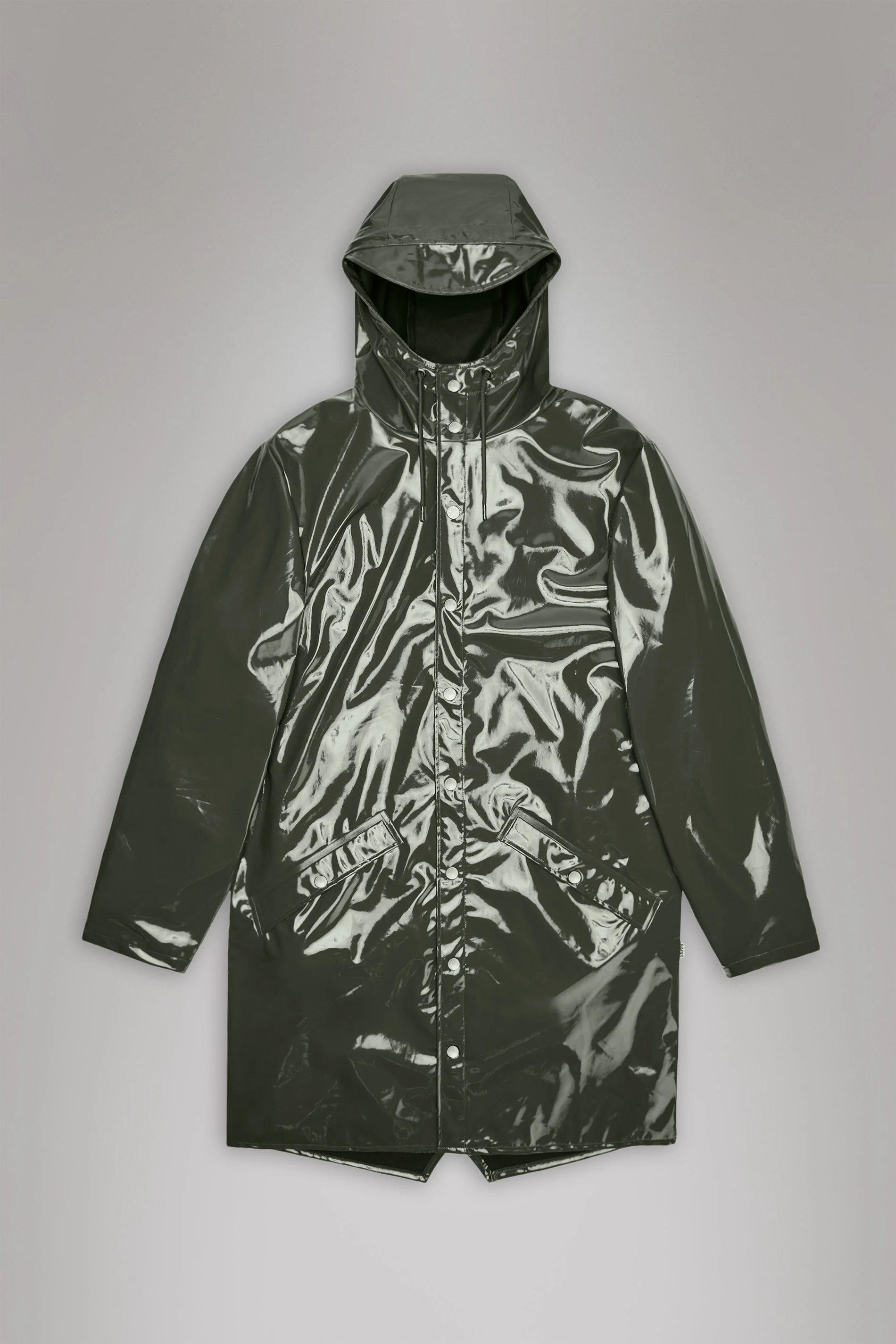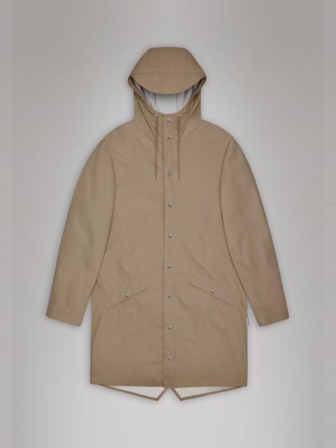 Long Jacket is an ever-contemporary unisex rain jacket. Characterized by a minimal silhouette in a long design. This rain jacket is a long version of Rains' classic rain jacket. It features a placket with snap fastenings for closure, hood with built-in cap and two side pockets with snaps. Sleeves are finished with snaps making them adjustable for a loose or tight fit. The design is easy-to-wear with an elegant drape. The unisex rain jacket is completed with under-arm eyelets and a back yoke with concealed vents for breathable comfort. Long Jacket is cut from Rains' signature PU fabric and features welded seams. The finish is lightweight with a smooth feel. SKU: 12020\127 Details Composition: 100.00% PES (Polyester) Water column: 5000 mm Windproof: Protection against windchill Fit: Long Weight: 19 oz Features: