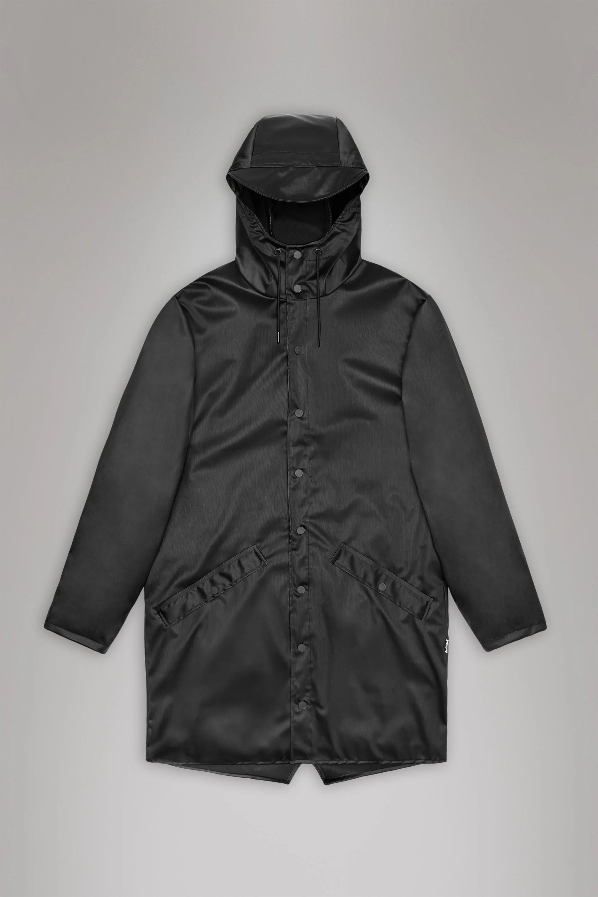 Long Jacket is an ever-contemporary unisex rain jacket. Characterized by a minimal silhouette in a long design. This rain jacket is a long version of Rains' classic rain jacket. It features a placket with snap fastenings for closure, hood with built-in cap and two side pockets with snaps. Sleeves are finished with snaps making them adjustable for a loose or tight fit. The design is easy-to-wear with an elegant drape. The unisex rain jacket is completed with under-arm eyelets and a back yoke with concealed vents for breathable comfort. Long Jacket is cut from Rains' signature PU fabric and features welded seams. The finish is lightweight with a smooth feel. SKU: 12020\84 Details Composition: 100.00% PES (Polyester) Water column: 5000 mm Windproof: Protection against windchill Fit: Long Weight: 19 oz Features - Waterproof signature PU fabric - Hood with built-in cap and drawstring - Placket with snap closure - Two side pockets with snaps - Snap adjustment at sleeve cuffs - Vents at arm holes and back yoke - Welded seams - Fishtail hem - Regular fit