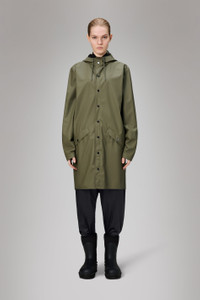 Long Jacket is an ever-contemporary unisex rain jacket. Characterized by a minimal silhouette in a long design. This rain jacket is a long version of Rains' classic rain jacket. It features a placket with snap fastenings for closure, hood with built-in cap and two side pockets with snaps. Sleeves are finished with snaps making them adjustable for a loose or tight fit. The design is easy-to-wear with an elegant drape. The unisex rain jacket is completed with under-arm eyelets and a back yoke with concealed vents for breathable comfort. Long Jacket is cut from Rains' signature PU fabric and features welded seams. The finish is lightweight with a smooth feel. SKU: 12020\134 Details Composition: 100.00% PES (Polyester) Water column: 5000 mm Windproof: Protection against windchill Fit: Long Weight: 19 oz Features: