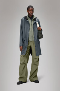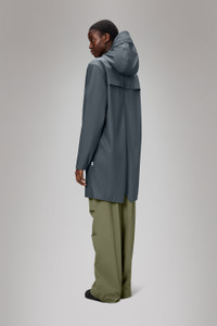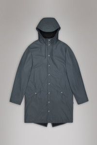 Long Jacket is an ever-contemporary unisex rain jacket. Characterized by a minimal silhouette in a long design. This rain jacket is a long version of Rains' classic rain jacket. It features a placket with snap fastenings for closure, hood with built-in cap and two side pockets with snaps. Sleeves are finished with snaps making them adjustable for a loose or tight fit. The design is easy-to-wear with an elegant drape. The unisex rain jacket is completed with under-arm eyelets and a back yoke with concealed vents for breathable comfort. Long Jacket is cut from Rains' signature PU fabric and features welded seams. The finish is lightweight with a smooth feel. SKU: 12020\124 Details Composition: 100.00% PES (Polyester) Water column: 5000 mm Windproof: Protection against windchill Fit: Long Weight: 19 oz Features: