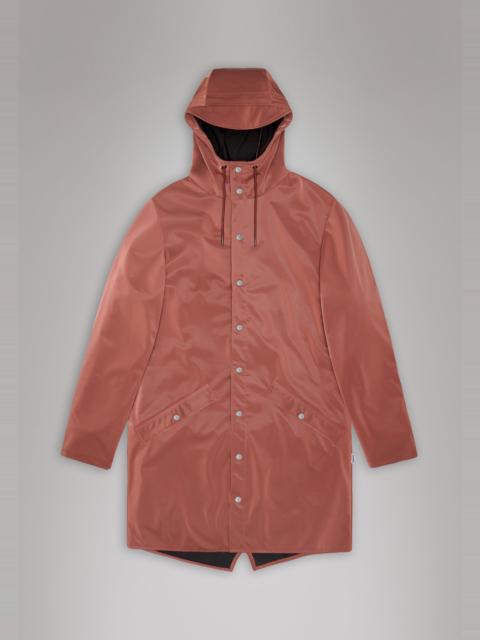 Long Jacket is an ever-contemporary unisex rain jacket. Characterized by a minimal silhouette in a long design. This rain jacket is a long version of Rains' classic rain jacket. It features a placket with snap fastenings for closure, hood with built-in cap and two side pockets with snaps. Sleeves are finished with snaps making them adjustable for a loose or tight fit. The design is easy-to-wear with an elegant drape. The unisex rain jacket is completed with under-arm eyelets and a back yoke with concealed vents for breathable comfort. Long Jacket is cut from Rains' signature PU fabric and features welded seams. The finish is lightweight with a smooth feel. SKU: 12020\131 Details Composition: 100.00% PES (Polyester) Water column: 5000 mm Windproof: Protection against windchill Fit: Long Weight: 19 oz Features: