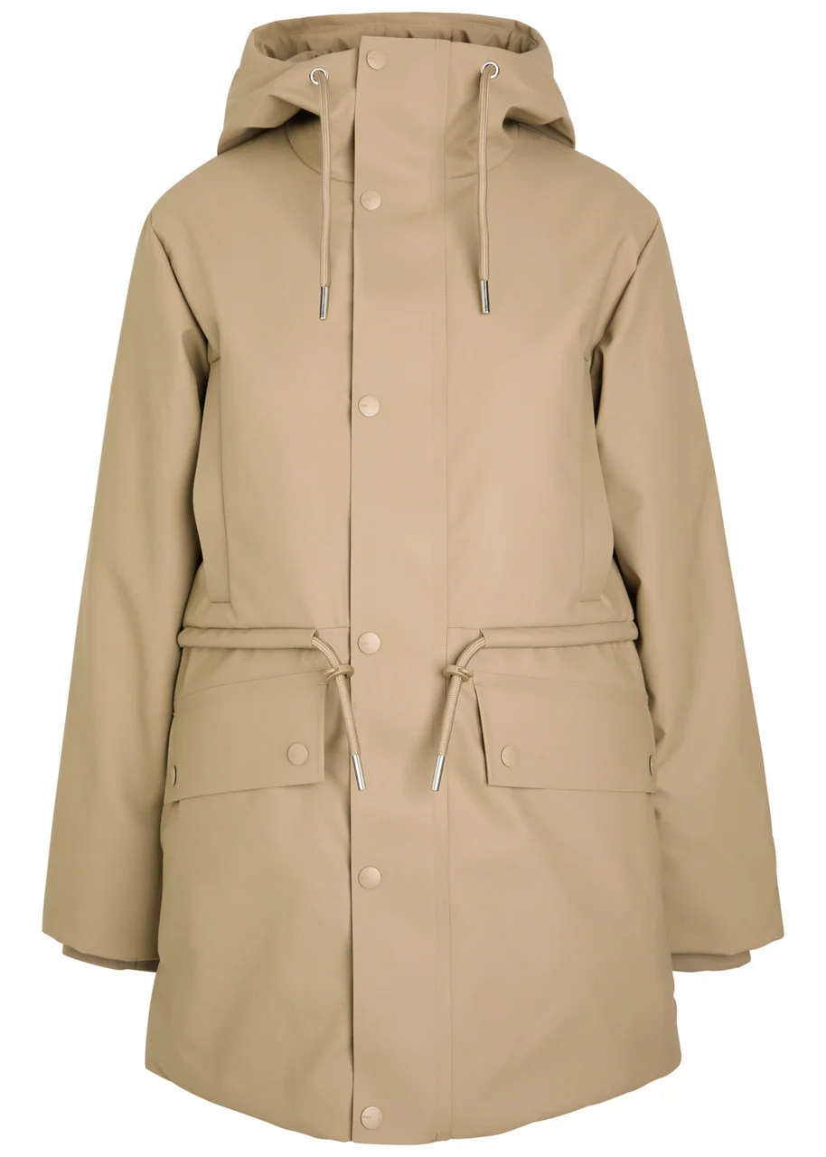 Info & Care Rains rubberised;parka; Waterproof, windproof, padded, drawstring hood, high-neck, concealed ribbed cuffs, four side slip pockets, drawstring waist, press-stud fastening front flap pockets, designer tag at side, notched back hem, concealed drawstring at hem, internal zip-fastening pocket, fully lined Partially concealed zip and press-stud fastenings through front 100% polyester; coating: 100% polyurethane Machine wash Size & Fit Length shoulder to hem: 31 inches/ 79cm Midweight Relaxed fit Model is 5'8"/ 173cm and wears a size small;