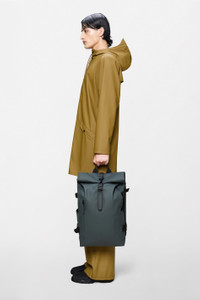 Rolltop Rucksack Large is a dependable city staple. The design interprets Rains' most iconic Rolltop Rucksack with larger proportions and additional functionality. Rolltop Rucksack Large is carefully designed to keep precipitation out when traveling from point A to Z. To protect essentials from rain, fold the rolltop into a tight scroll and secure using the signature carabiner. Open the rucksack to reveal a single main compartment. Exterior features include a side-access laptop pocket, front pocket with coated zipper and two side slip pockets. Cycle-ready features include a front D-ring -- ideal for holding bike locks -- and a buckle-fastened chest strap for a secure ride-proof fit. Rolltop Rucksack Large is cut from Rains' signature waterproof PU fabric, engineered for carrying strength, durability and a smooth feel. SKU: 14590\153 Details Dimensions: 24.8 in x 5.5 in x 12.6 in Capacity: 6.1 gal Composition: 100.00% PES (Polyester) Water column: 8000 mm Weight: 30.7 oz Features: