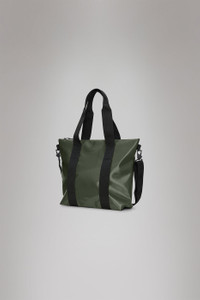 Tote Bag Mini is a waterproof tote perfect for shopping, commutes or the office. Characterized by an elevated utility-look and functional details. The full-length coated zip reveals a spacious main compartment for everyday essentials. Designed to meet your carry-needs, Tote Bag Mini offers various carrying options through its detachable shoulder strap and long hand/shoulder handles. Carry handles feature attachment rings for small items like keys. Tote Bag Mini is cut from Rains' signature PU fabric, engineered for carrying strength, durability and a smooth feel. SKU: 14160\127 Details Dimensions: 14.2 in x 5.1 in x 15.7 in Capacity: 4.2 gal Composition: 100.00% PES (Polyester) Water column: 8000 mm Weight: 21.2 oz Features - Waterproof signature PU fabric - Coated tonal zip closure - Single main compartment - Long hand/shoulder webbing handles with attachment ring - Detachable webbing shoulder strap