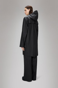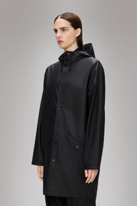 Long Jacket is an ever-contemporary unisex rain jacket. Characterized by a minimal silhouette in a long design. This rain jacket is a long version of Rains' classic rain jacket. It features a placket with snap fastenings for closure, hood with built-in cap and two side pockets with snaps. Sleeves are finished with snaps making them adjustable for a loose or tight fit. The design is easy-to-wear with an elegant drape. The unisex rain jacket is completed with under-arm eyelets and a back yoke with concealed vents for breathable comfort. Long Jacket is cut from Rains' signature PU fabric and features welded seams. The finish is lightweight with a smooth feel. SKU: 12020\01 Details Composition: 100.00% PES (Polyester) Water column: 5000 mm Windproof: Protection against windchill Fit: Long Weight: 19 oz Features - Waterproof signature PU fabric - Hood with built-in cap and drawstring - Placket with snap closure - Two side pockets with snaps - Snap adjustment at sleeve cuffs - Vents at arm holes and back yoke - Welded seams - Fishtail hem - Regular fit