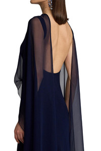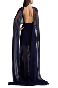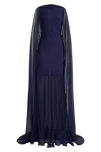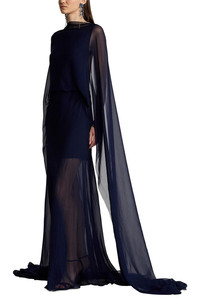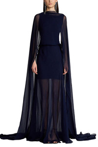 DETAILS AND INSIGHT Ralph Lauren dylon washed chiffon evening dress in lux navy. The Dylon Redefines Modern Elegance With Its One-Of-A-Kind, Layered Design. Featuring A Slim-Fitting Silk Georgette Mini Dress At The Interior, This Dramatic Evening Style Is Distinguished By A Washed Chiffon Exterior, Which Drapes Beautifully Down The Body To Create A Scarf Neckline, Long Sleeves, And A Floor-Length Silhouette. Bottom Layer: 100% Silk (Mulberry), Top Layer: 100% Silk (Mulberry) Dry Clean Made In Italy Style 290975321001_251-2WDB