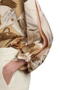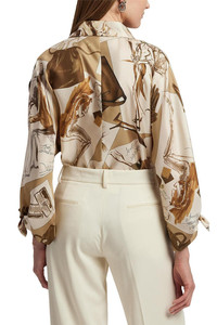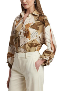 DETAILS AND INSIGHT Ralph Lauren karen blouse in tan multi. Traditional Men’S Shirting Details—Including A French Placket And A Spread Collar—Merge With An Unexpected Open-Sleeve Construction In This Version Of The Karen Blouse. Crafted From Silk Twill, This Style Is Printed In A Renowned Como, Italy, Mill With The Season’S Diary-Inspired Pattern—A Beautiful Collection Of Motifs Depicting Various Ralph Lauren Sketches And Accessories In A Versatile, Neutral Palette. 100% Silk (Mulberry) Dry Clean Made In Italy Style 290P00352001-2WCE