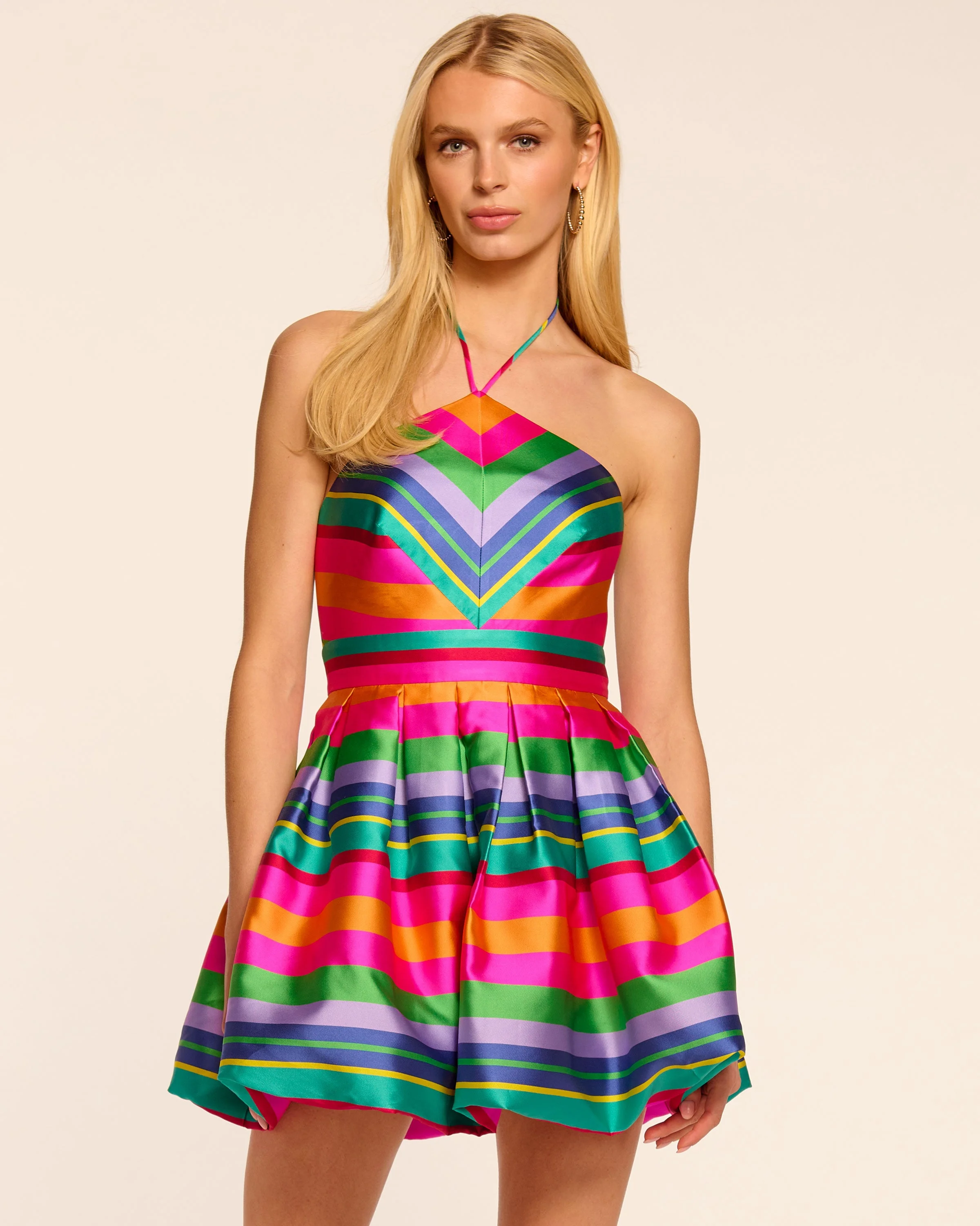 Playful and chic, the Joey features a halter neckline, bubble skirt, and fitted bodice. Crafted from striped poolside satin, it’s perfect for daytime celebrations or garden parties, offering a fun yet sophisticated vibe. Details & Care – Halter neckline with self tie – Bubble skirt – Fitted bodice – Invisible centerback zipper – Dry Clean or Hand Wash – Style #: E02253049 – 100% Polyester – Lining: 100% Polyester" Size & Fit – Model is Wearing Size 0 – Model is 5'9" – Length: 33.5", based on a size 2