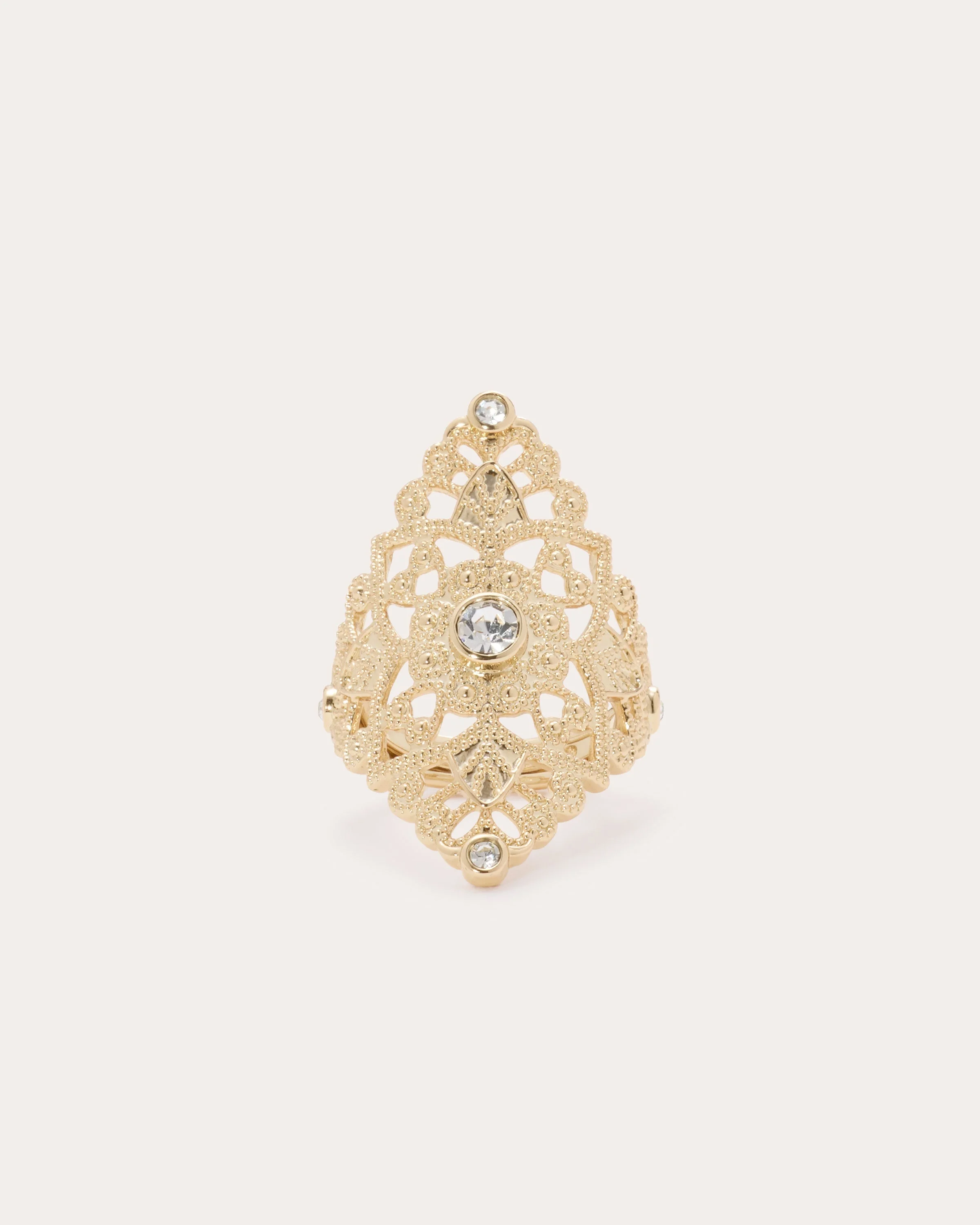 The Laya brings dramatic filigree to your fingers with undeniable presence. A statement ring for those who love bold, artisan-inspired jewelry that starts conversations and commands attention. Details & Care – Gold plated brass – Cubic zirconia detail – Lead-free, nickel-free, hypoallergenic – Dry Clean or Hand Wash – Style #: J02264000 – 90% Brass – 2% Cz – 8% Czech Glass