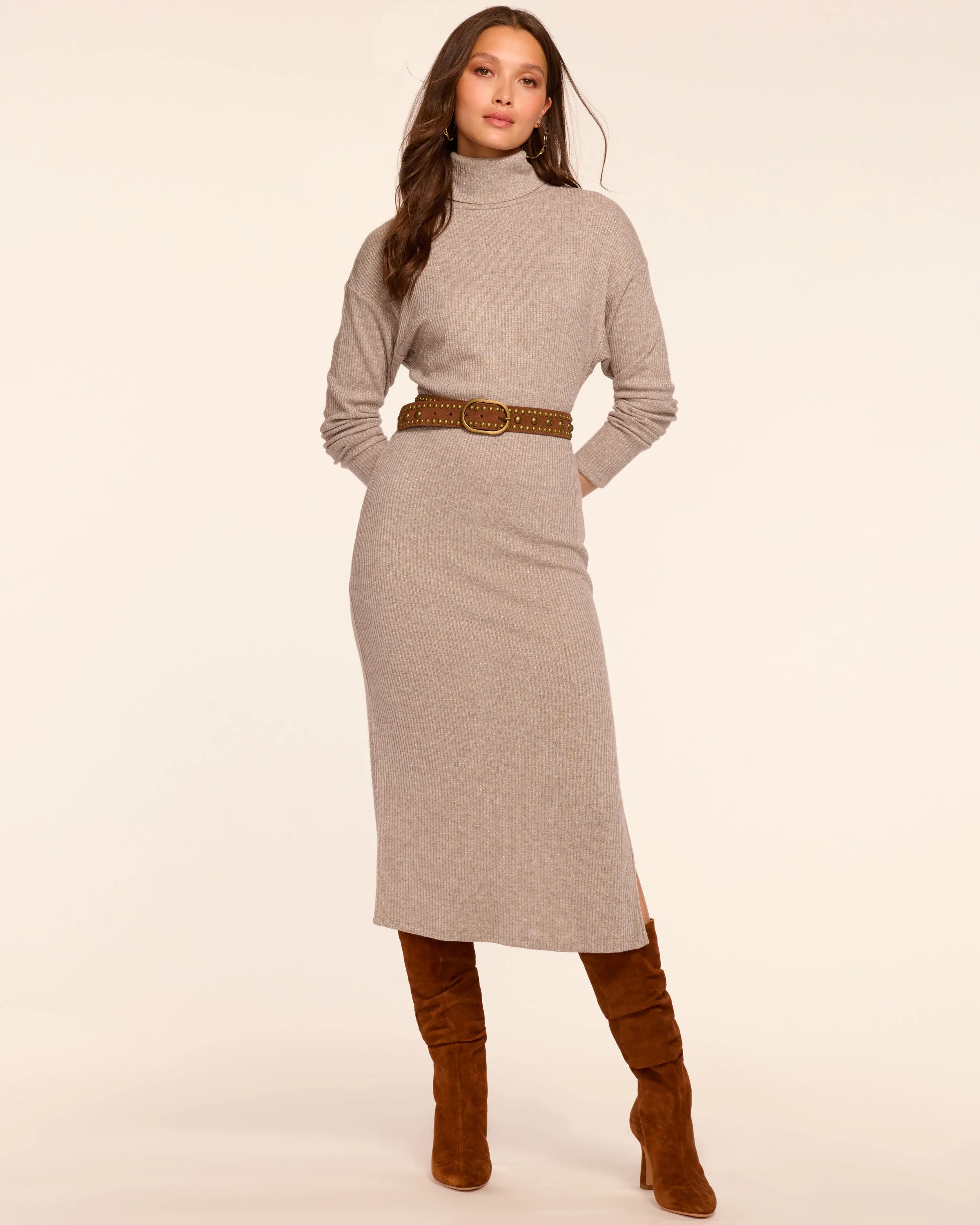 Cozy meets glam in the Meeghan. This midi sweater dress has that perfect slouchy fit with just enough shimmer to catch the light. And the side slit adds a flirty touch–wear it to brunch and watch heads turn. Comfort never looked so good. Inspired by Meeghan Mullin's signature style, this exclusive Ramy Brook x @meeghanm piece brings her effortless, chic aesthetic to your wardrobe. Details & Care – Unlined – Turtleneck – Ribbed knit – Subtle lurex – Side slit – Relaxed fit – Long sleeve – Bra-friendly – Dry Clean or Hand Wash – Style #: A10253025 – 43% Viscose 36% Polyester 17% Polyamide 4% Metallic Polyester Size & Fit – Model is 5'9"
