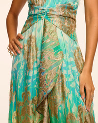 The Stephanie flows with cascading ruffles and a plunging halter neckline in metallic jacquard that shifts from bright to deeper tones like a tropical sunset. This is your showstopping piece for making unforgettable entrances at destination weddings and glamorous celebrations. Details & Care – Lined – Plunging halter neckline with tie at back of neck – Metallic jacquard – Invisible center back zipper – Cascading ruffle – Dry Clean or Hand Wash – Style #: E02263034 – 69% Viscose 20% Polyester 11% Metallic Lining:100% Polyester Size & Fit – Model is 5'9" – Length: 64", based on a size 2