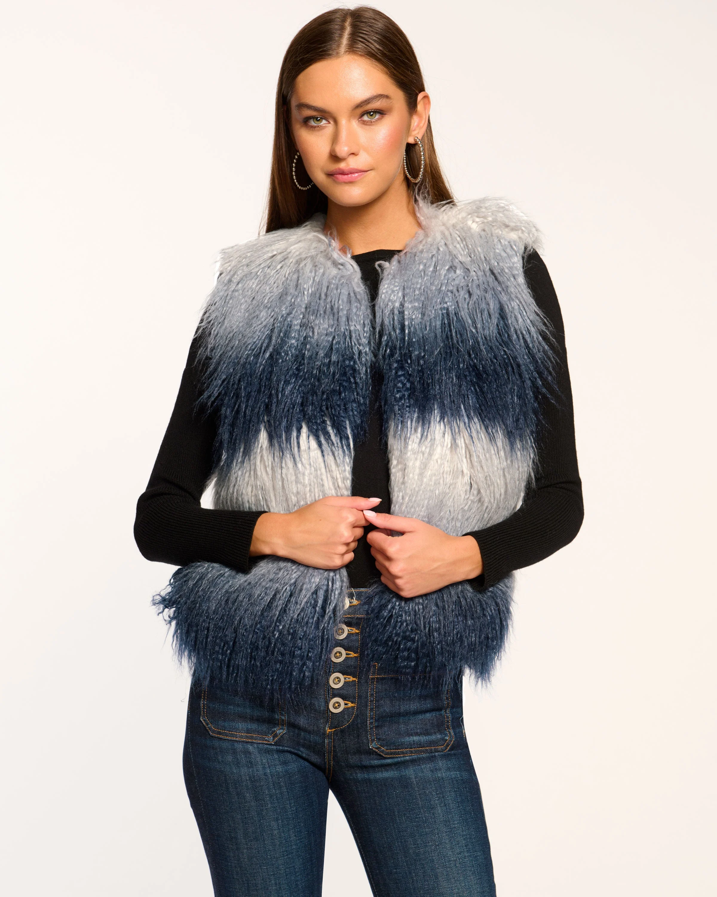 Top off your look with the Walter, a statement vest in a high impact faux fur. The blue ombre shades complement a pair of medium or dark wash jeans perfectly. Details & Care – Lined – Sleeveless vest silhouette – Hook and eye closure – Dry Clean or Hand Wash – Style #: A10244006 – 70% Modified Acrylic 17% Acrylic 13% Polyester – Lining: 100% Polyester Size & Fit – Model is Wearing Size XS – Model is 5'9"