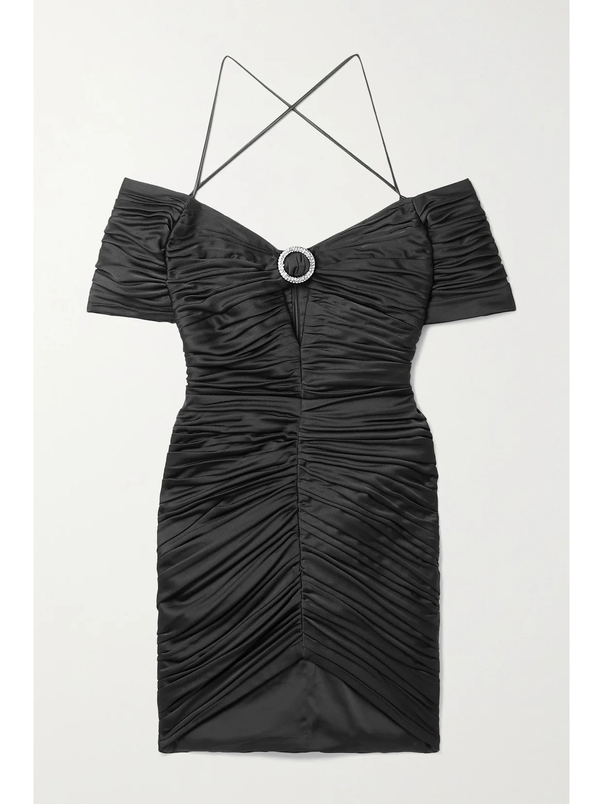 RASARIO's mini dress is inspired by glamorous styles worn in the '80s. Made from smooth black satin, it's flatteringly ruched throughout and has a cutout center detailed with crystal-embellished hardware. The pin-thin straps crisscross beautifully to frame your decolletage.