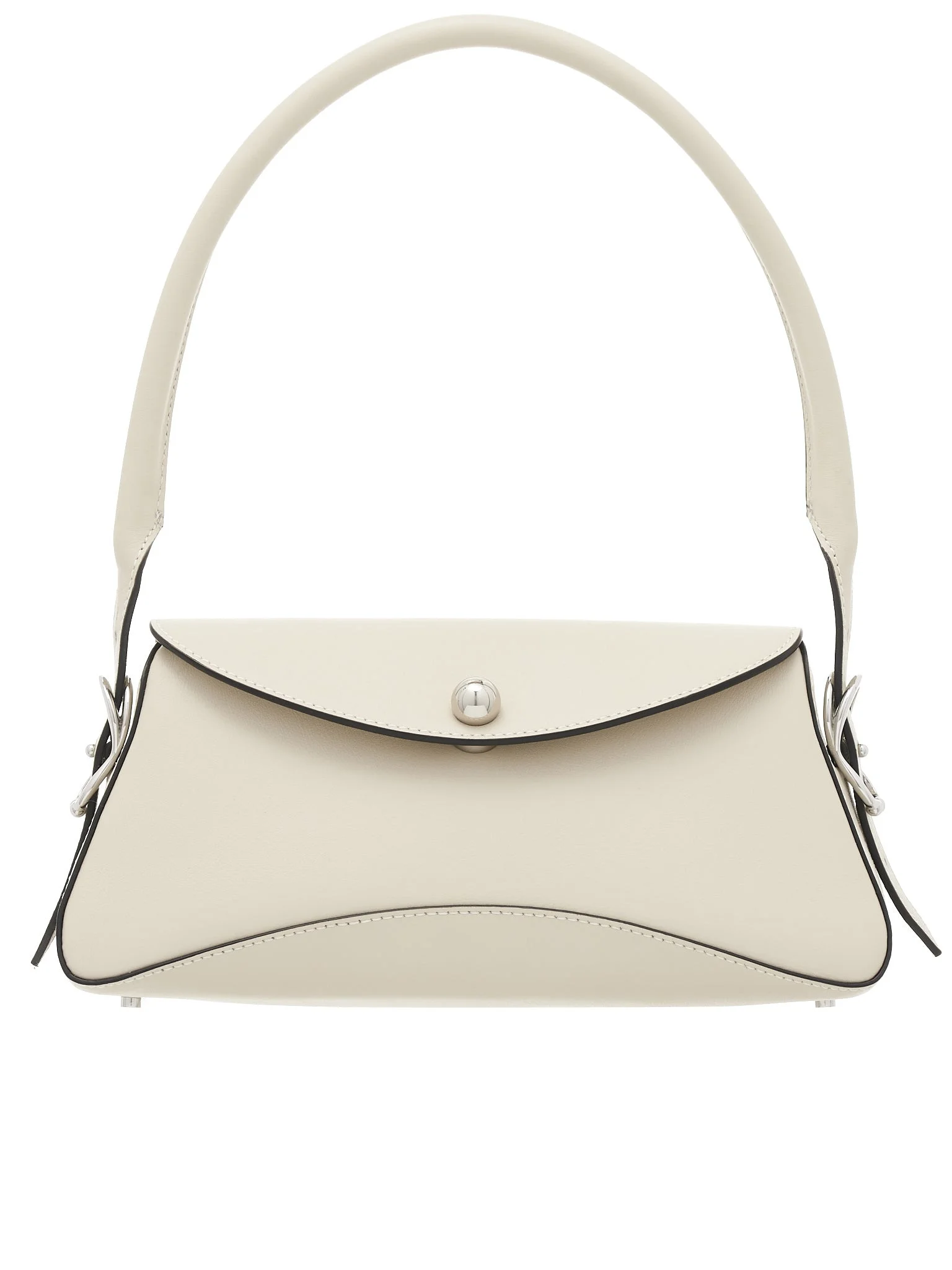 Ratio Et Motus bag in cream, single adjustable strap, button closure, contrasting piping detailing throughout, foiled print logo embellishment, silver-tone hardware. Made in Italy. One Size. Composition: (Main): 100% Leahter, (Lining): 100% Vegan Lambskin Leather.
