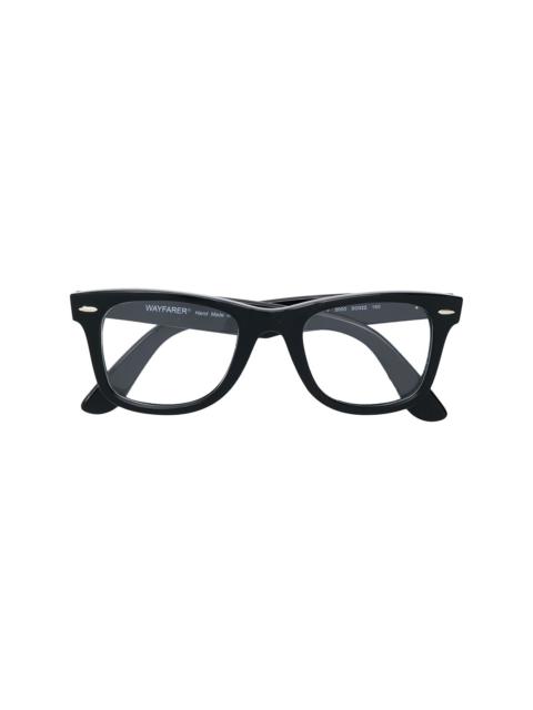 Wayfarer frame glasses Black Wayfarer frame glasses from Ray-Ban featuring a logo decal on the lens, wayfarer frames, a logo to the arm and straight arms with curved tips. Made in Italy. This item comes with a protective case. Made in Italy Composition Acetate 100% SIZE & FIT Measurement Bridge Width 0.86 in(2.2 cm) Lens Diameter 1.96 in(5 cm) Total Width 5.59 in(14.2 cm) Arm Length 5.9 in(15 cm)