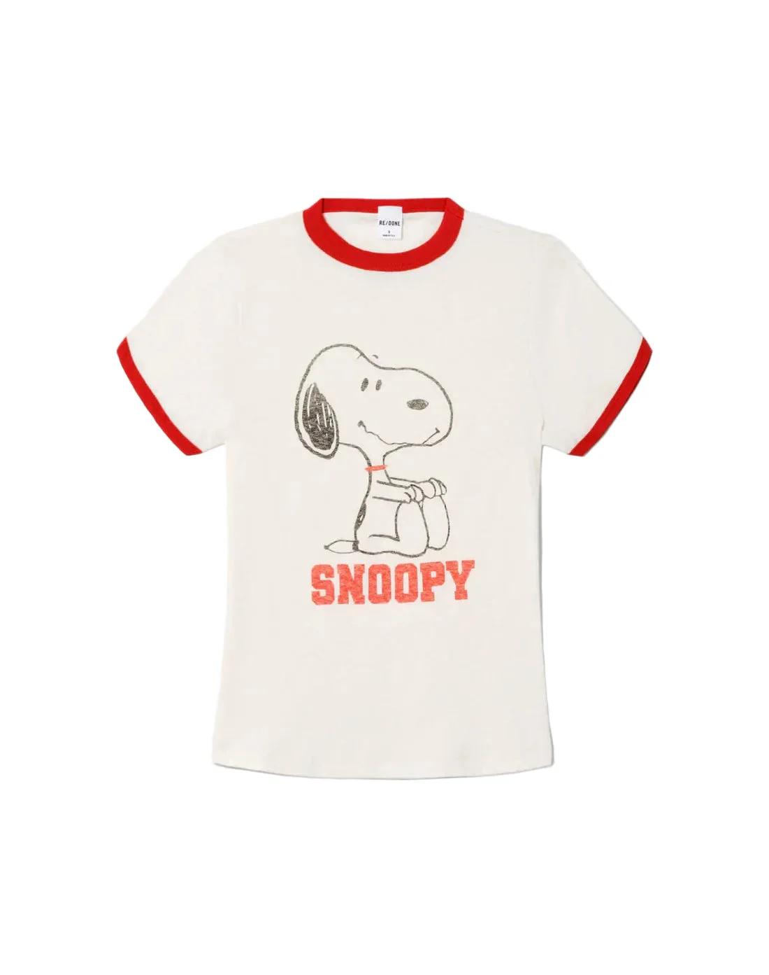 RE/DONE's 60's Slim Ringer Tee showcases an iconic Snoopy graphic on soft tri-blend jersey. The vintage-inspired design features contrast binding at the neckline and sleeves, capturing retro charm with modern comfort. A timeless piece for Peanuts fans and vintage tee collectors alike.