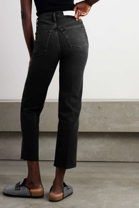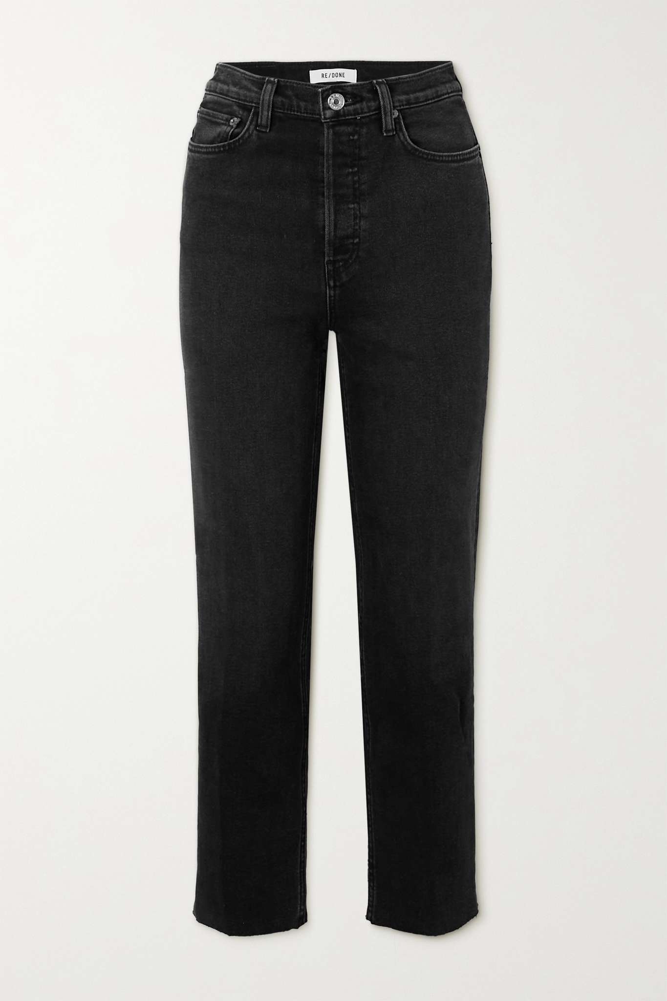 EDITORS'NOTES RE/DONE's '70s Stove Pipe' jeans are cut from rigid black denim that's faded and distressed at the knees for an authentically vintage look. They have a flattering high-rise waist and straight legs that are cropped just above the ankles. Wear yours with everything from relaxed tees to chunky knits. SIZE & FIT - Fits true to size, however those who are between sizes should take the smaller size - High-rise, cut for a straight-leg fit - Cropped length - Mid-weight, stretchy fabric - Size 25 jeans have an inside leg of 26”/ 67cm - Model is 177cm/ 5'10" and is wearing a size 25 DETAILS & CARE - Black stretch-denim - Partially concealed button fastenings along front - 95% cotton, 4% elastane, 1% spandex - Machine wash - Designer wash: Washed Noir