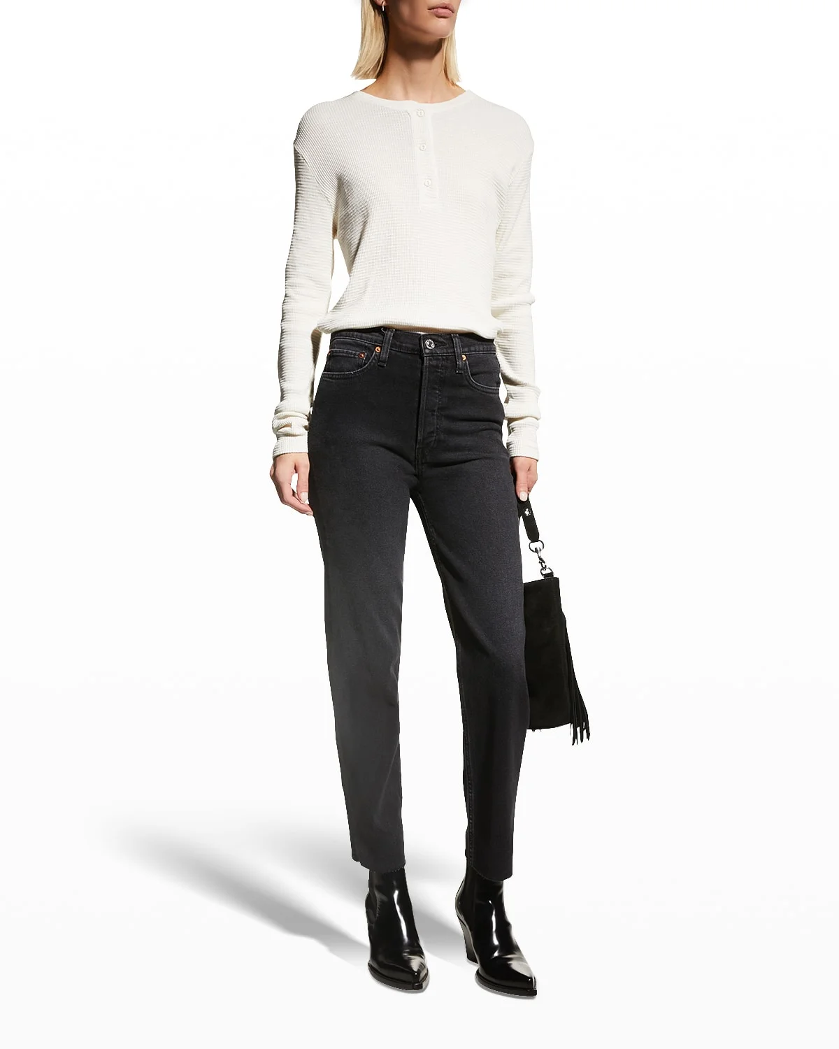 RE/DONE '70sinspired jeans in dark gray wash denim. Approx. 27" inseam. Fivepocket style. Straight legs. Cropped above ankles. Rawedge hem. Full button fly. Cotton/elasterell p/spandex. Machine wash. Imported.