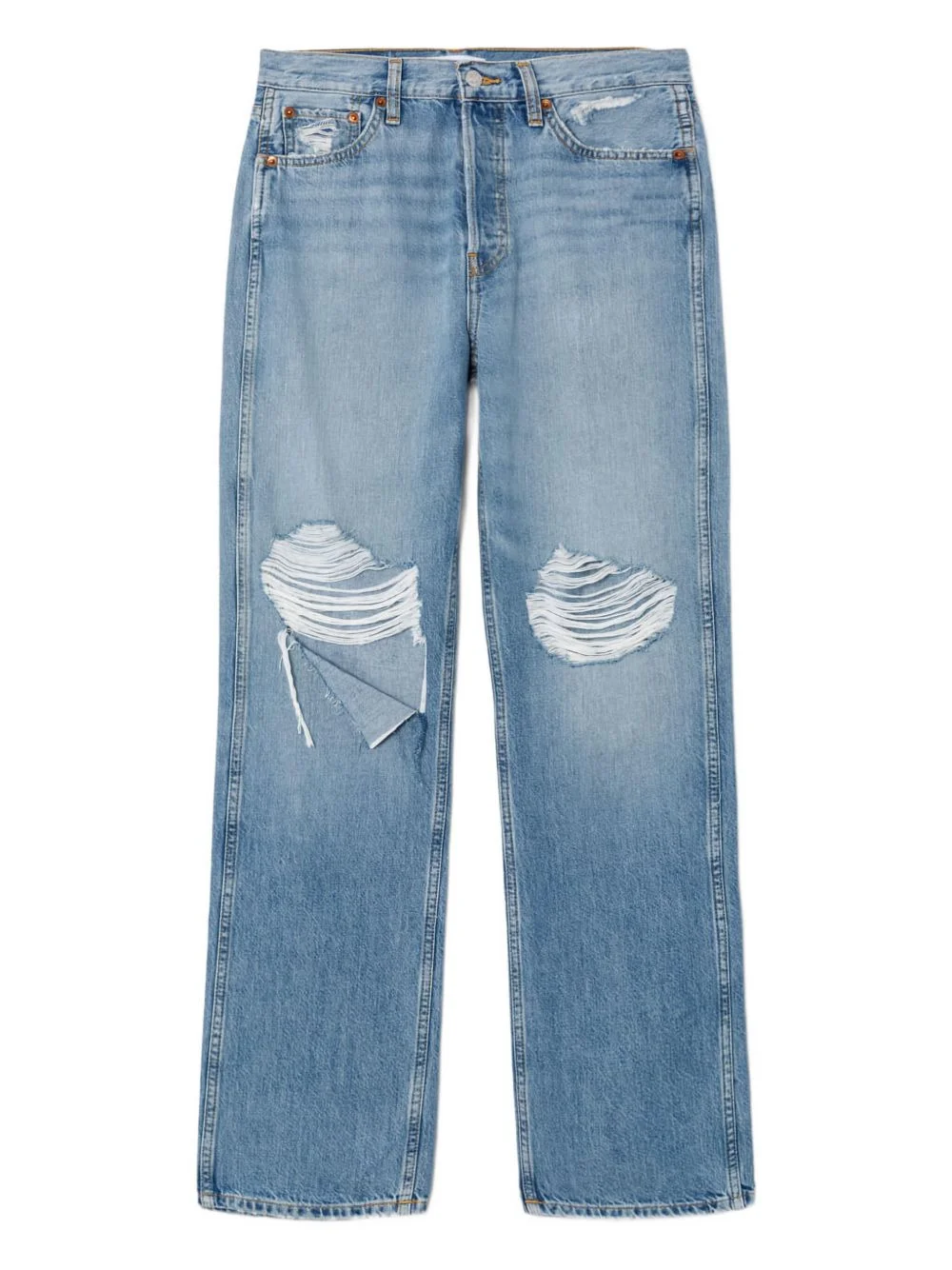 90s high-rise distressed jeans Highlights - Light blue - High waist - Distressed detailing - Button fly Imported Composition Cotton 64%, Lyocell 36% SIZE & FIT FittingInformation Designed for a straight-leg fit, these jeans allow for a close fit at the waist and an unrestricted and comfortable fit over the leg Constructed from stretch denim, this piece offers a stretch fit with durability Washing instructions Machine Wash