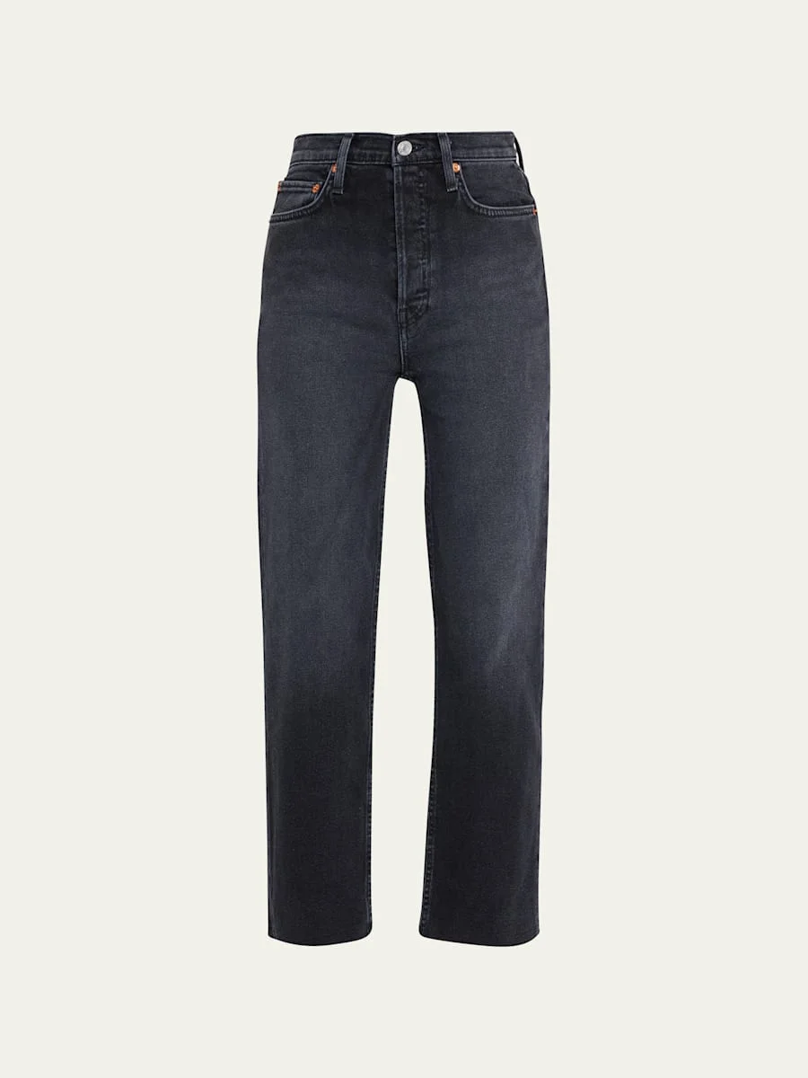 RE/DONE '70s-inspired jeans in dark gray wash denim. Approx. 27" inseam. Five-pocket style. Straight legs. Cropped above ankles. Raw-edge hem. Full button fly. Cotton/elasterell p/spandex. Machine wash. Imported. Model is 5'10"/177cm. Online Inquiries: BGS21_T4899| Store Inquiries: #4010167