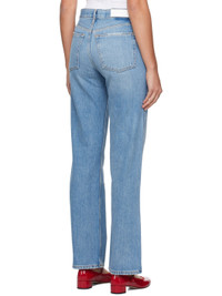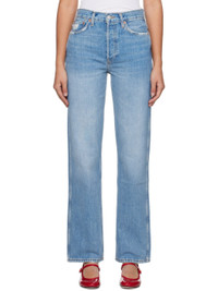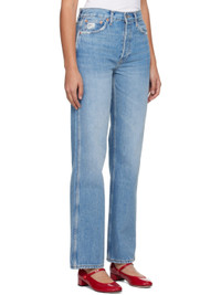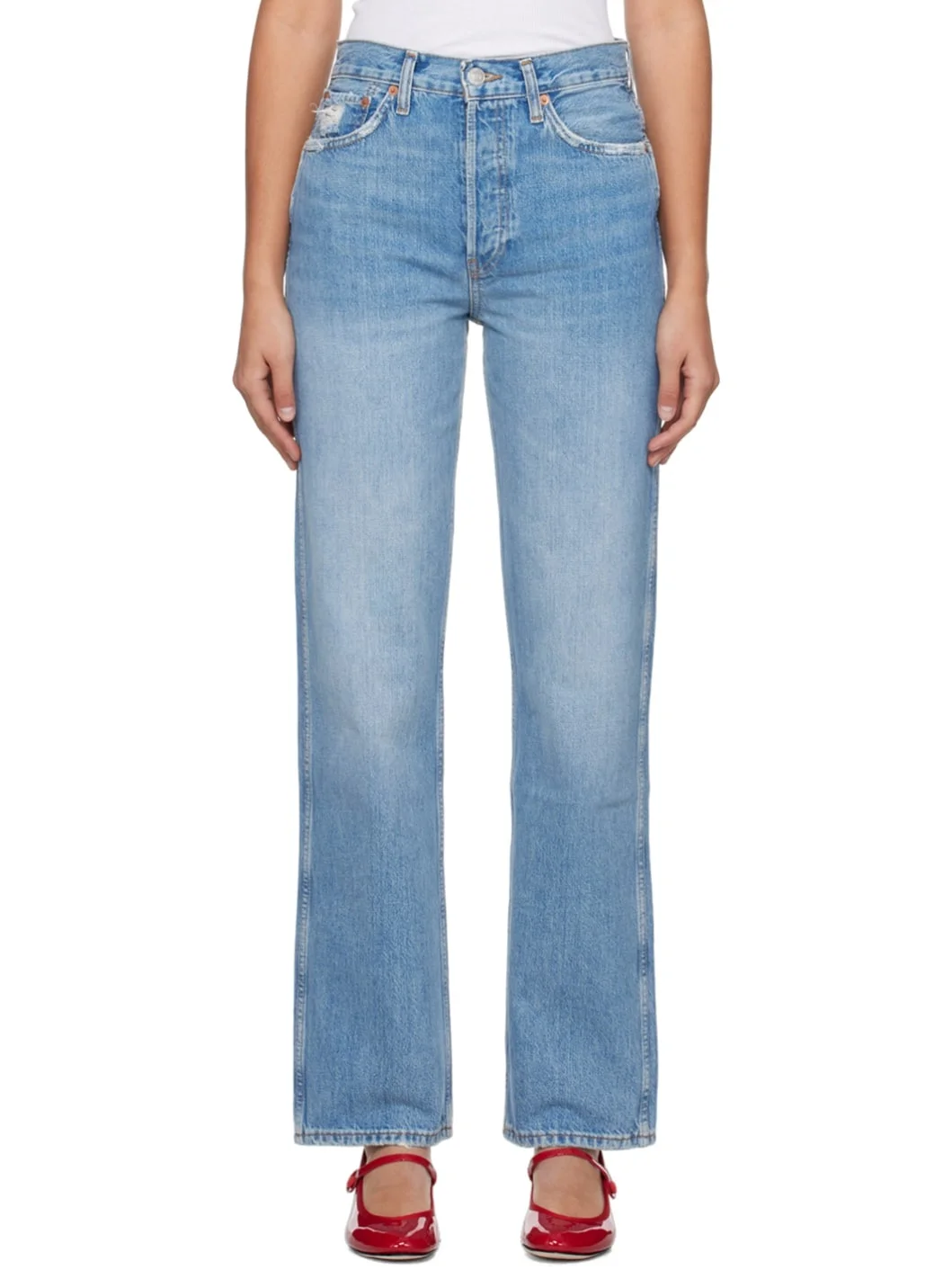 Relaxed-fit non-stretch denim jeans. Subtle distressing and fading throughout. · High-rise · Belt loops · Five-pocket styling · Button-fly · Leather logo patch at back waistband Supplier color: Worn blue Body: 100% cotton. Lining: 65% polyester, 35% cotton. Made in Turkey 241800F069002