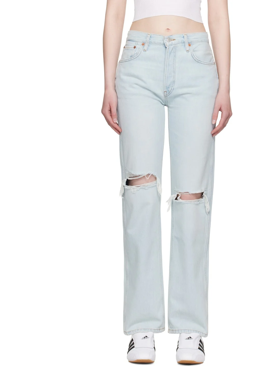 Non-stretch organic cotton denim jeans. Fading, whiskering, and subtle distressing throughout. · Loose-fit · High-rise · Belt loops · Five-pocket styling · Button fly · Rip at knees · Logo patch at back waistband · Contrast stitching in tan Supplier color: Bleach destroy Body: 100% organic cotton. Lining: 65% polyester, 35% cotton. Made in Turkey 252800F069003