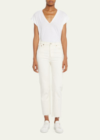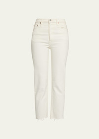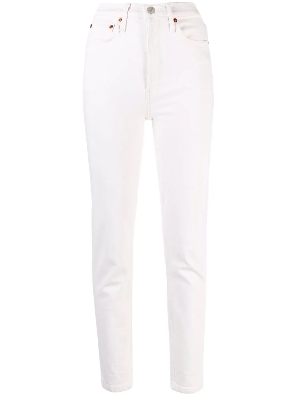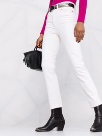 Comfort Stretch ankle-crop jeans Vintage white cotton-blend Comfort Stretch ankle-crop jeans from RE/DONE featuring stretch-design, front button and zip fastening, belt loops, classic five pockets, logo patch to the rear and cropped leg. POSITIVELY CONSCIOUS: All RE/DONE denim products are made of repurposed vintage Levi's jeans that are turned into modern, designer-style products. You can be confident that your choice is positive for the Planet.. Imported Composition Outer: Cotton 98%, Elastane 2% Lining: Polyester 65%, Cotton 35% SIZE & FIT Model measurements Height 5 ft 11 in(1.8 m) Bust/Chest 31.9 in(81 cm) Hips 33.9 in(86 cm) Waist 23.6 in(60 cm) FittingInformation This piece fits true to size. We recommend you get your regular size Cut for a slim fit Made with a mid-weight stretch fabric