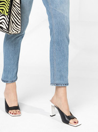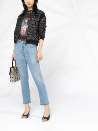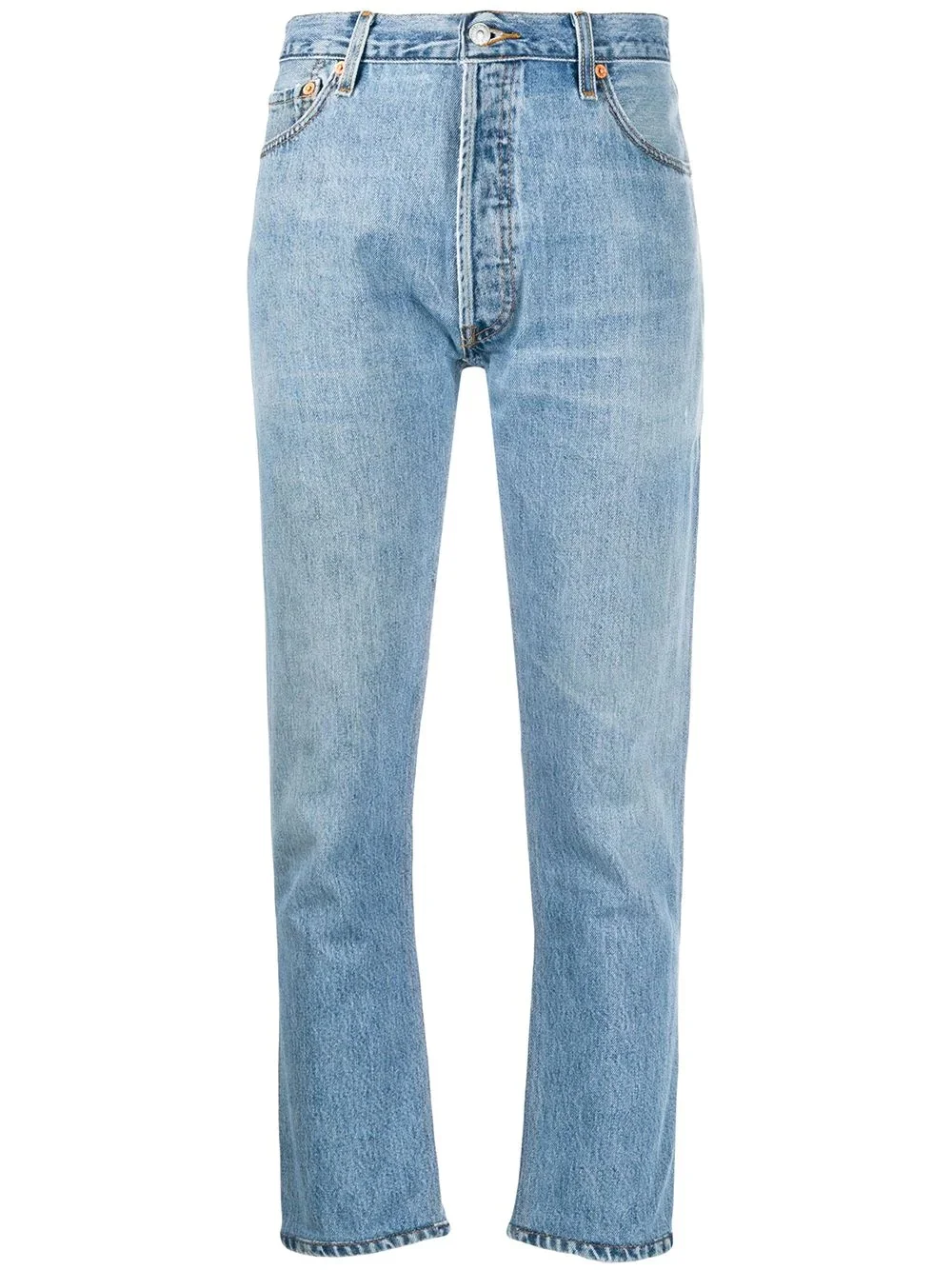 high-rise cropped jeans Indigo blue cotton high-rise cropped jeans from RE/DONE featuring a button and zip fly, a belted waist, a five pocket design and a slim fit. Please note this RE/DONE item is reconstructed using vintage Levi's pieces, therefore it is unique and may vary slightly from the item pictured. Made in United States Composition Cotton 100% SIZE & FIT Model measurements Height 5 ft 10 in(1.77 m) Bust/Chest 30.31 in(77 cm) Hips 34.25 in(87 cm) Waist 24.01 in(61 cm) FittingInformation This piece fits true to size. We recommend you get your regular size Cut for a slim fit Made with a mid-weight non-stretch fabric Washing instructions Machine Wash