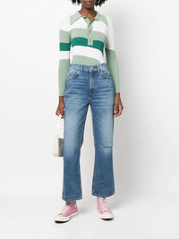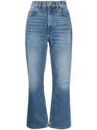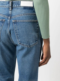 high-rise flared jeans blue cotton flared button fly fastening belt loops classic five pockets POSITIVELY CONSCIOUS: This Planet Conscious product is crafted from certified recycled or upcycled materials, which helps you make a better choice for the environment as they generate less energy, save water and reduce the need for new raw materials. For recycled synthetic clothing products we highly recommend using a microfibre-catching washing bag to ensure that no microplastics that can pollute water are released in the process. Imported Composition Lining: Polyester 65%, Cotton 35% Outer: Cotton 100% SIZE & FIT Model measurements Height 5 ft 10 in(1.78 m) Bust/Chest 31.49 in(80 cm) Hips 37 in(94 cm) Waist 23.62 in(60 cm) FittingInformation This piece fits true to size. We recommend you get your regular size Designed to be fitted at the waist and hips, loose over the leg Made with a mid-weight non-stretch fabric Washing instructions Machine Wash