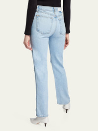 RE/DONE light-wash jeans in rigid denim with whiskering and fading. High rise. Five-pocket style. Straight-legs. Button/zip fly; belt loops. Cotton. Made in USA of imported material. Online Inquiries: BGS21_T4TZQ| Store Inquiries: #2760027