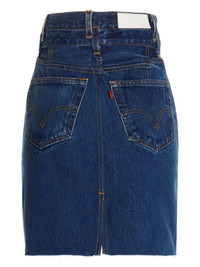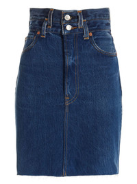 high-waisted denim skirt Highlights - Dark blue - Five pocket design - Button and concealed zip closure - Contrast stitching - Raw hem - Back yoke detailing Imported Composition Cotton 100%