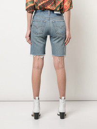 knee length denim shorts Indigo blue cotton knee length denim shorts from RE/DONE featuring a mid rise, a button and zip fly, a waistband with belt loops, a five pocket design, a faded effect and frayed edges. Made in United States Composition Cotton 100% SIZE & FIT Model measurements Height 5 ft 10 in(1.77 m) Bust/Chest 31.88 in(81 cm) Hips 33.85 in(86 cm) Waist 24.01 in(61 cm) Washing instructions Machine Wash