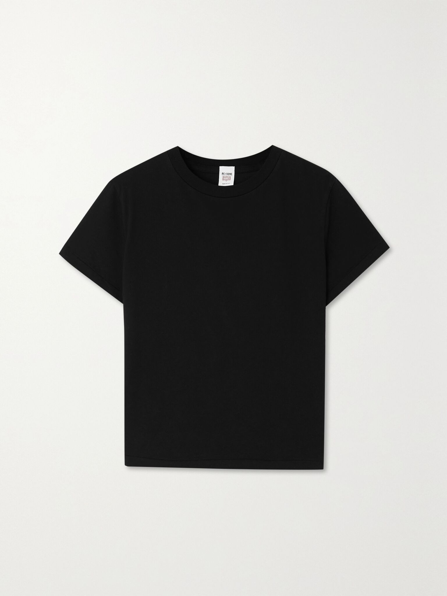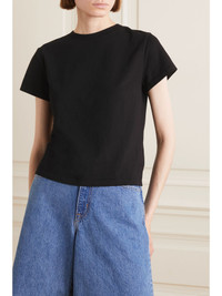A black T-shirt probably gets the most use out of anything in your wardrobe, so it's worth investing in one that's well-made. RE/DONE's version is cut from soft cotton-jersey with plenty of recycled fibers and has a slightly loose fit. Layer yours with a blazer and white jeans. Size & Fit - Fits true to size, take your normal size - Designed for a slightly loose fit - Lightweight, slightly stretchy fabric - Model is 180cm/ 5’11” and is wearing a size Small Details & Care - Black recycled cotton-jersey - 50% recycled cotton, 50% cotton - Machine wash