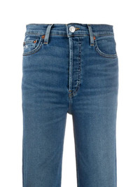 ripped stonewashed jeans Blue cotton blend ripped stonewashed jeans from RE/DONE featuring a stonewashed effect, ripped details, a waistband with belt loops, a branded rear patch, a straight leg, a regular length, a button and zip fly and a five pocket design. Imported Composition Outer: Cotton 96%, Polyester 3%, Lycra 1% Lining: Polyester 65%, Cotton 35% Washing instructions Machine Wash