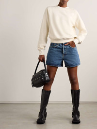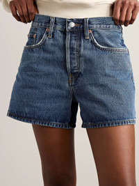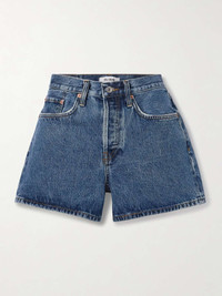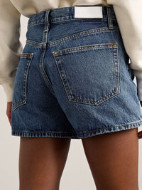 EDITORS'NOTES Once you button up a pair of RE/DONE's shorts, you'll want to wear them repeatedly. Made from organic cotton, they're cut to a high-rise waist and turn to reveal the label's logo patch. Channel the brand's laid-back Californian mood and team with a simple tank and plaid shirt. Lower-Impact Materials. This product is made using at least 50% lower-impact materials or ingredients. Find out more about our NET SUSTAIN criteria here. Large to size. See Size & Fit notes. SIZE & FIT - Fits large to size, take one size smaller than normal - High-rise, cut for a loose fit - Mid-weight, non-stretchy fabric - Model is 177cm/ 5'10", normally wears a size 26 and is wearing a size 25 DETAILS & CARE - Blue organic denim - Partially concealed button fastenings along front - 100% organic cotton - Machine wash - Designer wash: Blue Mere