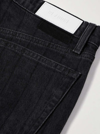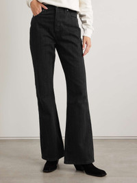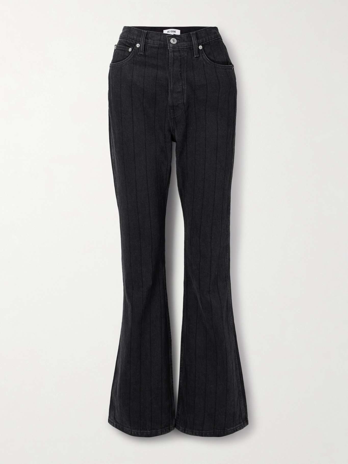 RE/DONE's jeans are designed with flared legs that give them a retro vibe. They sit high on the waist and come in the brand's black 'Night Rider' wash that features subtle, tonal stripes. Size & Fit - Fits true to size, take your normal size - High-rise, cut for a slim fit with a flared hem - Mid-weight, non-stretchy denim - Size 27 jeans have an inside leg of 34"/ 86cm - Model is 180cm/ 5'11" and is wearing a size 27 Model measurements: - Bust: 81cm/ 32” - Waist: 62cm/ 24.5” - Hip: 88cm/ 34.5” Details & Care - Black denim - Partially concealed button fastening along the front - 95% cotton, 4% elastrell-p, 1% spandex; lining: 65% polyester and 35% cotton - Machine wash - Designer wash: Night Rider
