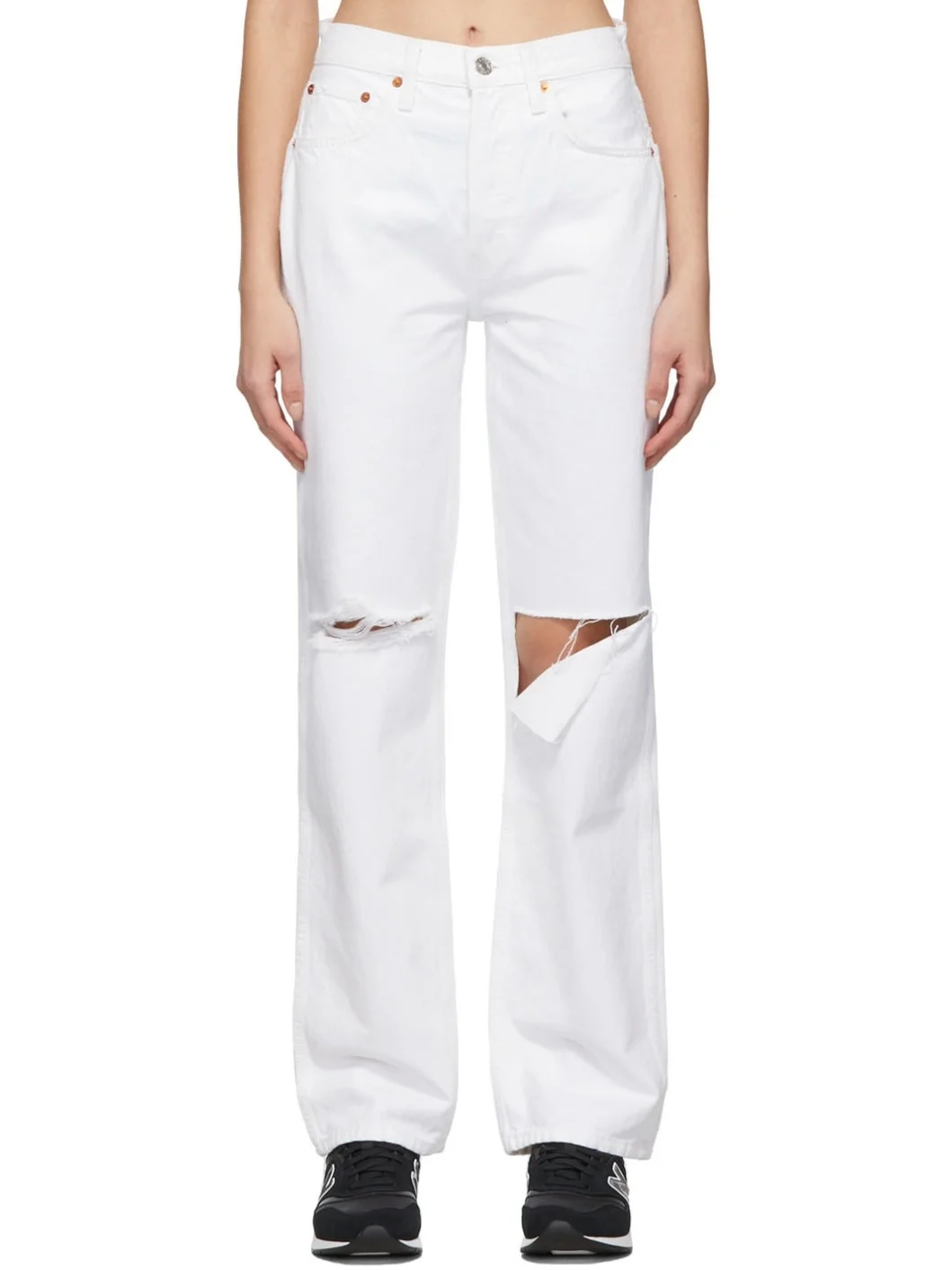 Relaxed-fit non-stretch denim jeans in white. Fading and distressing throughout. · High-rise · Five-pocket styling · Belt loops at waistband · Logo embossed leather logo patch in white at back waistband · Button-fly · Logo-engraved silver-tone and bronze-tone hardware Supplier color: White with rips Body: 100% cotton. Trim: 65% polyester, 35% cotton. Made in Mexico 221800F069017