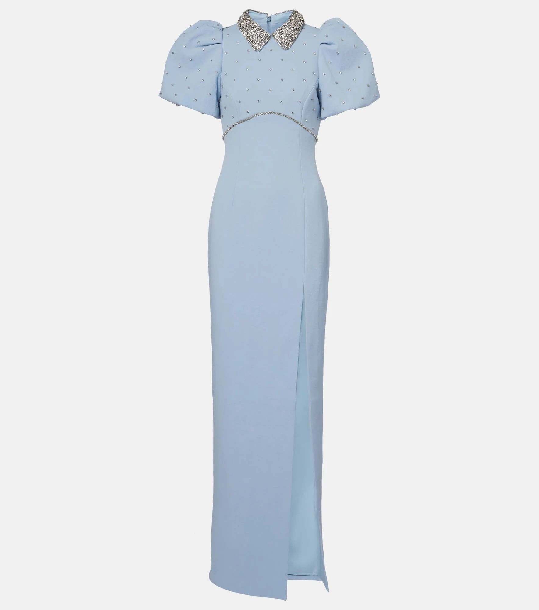 For eye-catching occasionwear, you can always count on Rebecca Vallance. The Amery gown features voluminous puff sleeves, a daring side slit, and gleaming embellishments at the bodice and collar. Product Details - Material: 98% polyester, 2% elastane - Care instructions: dry clean - Made in China - Designer color name: Pale Blue - Item color: blue - Lining: 97% polyester, 3% elastane - Closure: zipped back - Long vent - Item number: P01078309 Size & Fit - True to size - Oversized shoulders - Fitted - Non-stretchy fabric - The model seen in the picture is 178cm-5'10" and wearing a size UK 6