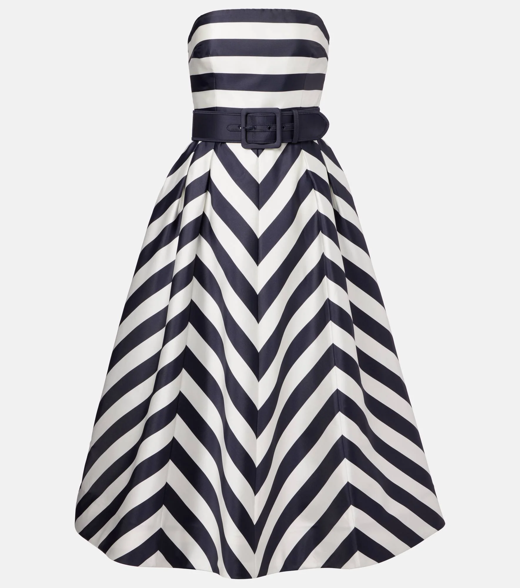Product Details - Material: 100% polyester - Care instructions: dry clean - Made in China - Designer color name: Navy/Ivory Stripe - Item color: blue, white - Detachable belt - Closure: zipped back - Item number: P01042179 Size & Fit - True to size - Strapless - Cinched waist - Non-stretchy fabric - The model seen in the picture is 178cm-5'10" and wearing a size UK 6